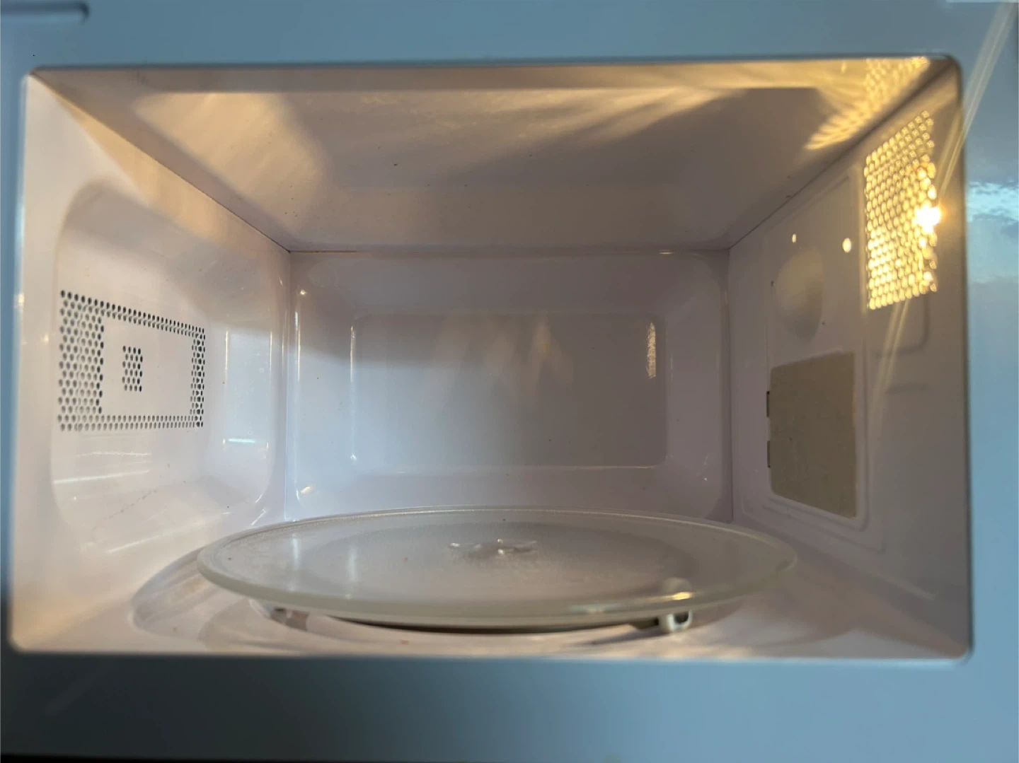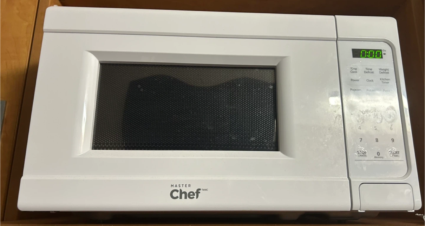 This is a white Master Chef microwave oven. It has a digital display and various cooking functions. Perfect for quickly heating up meals or defrosting food.