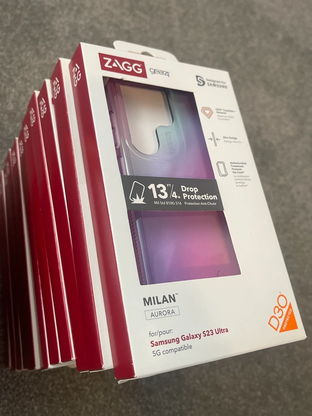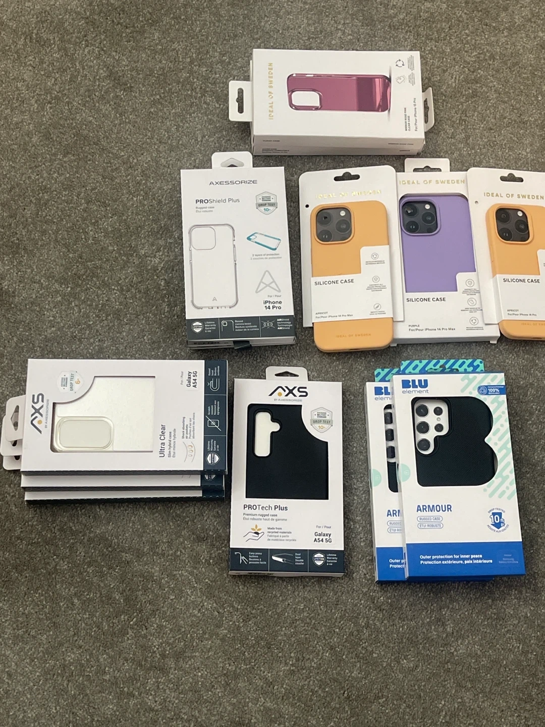 Bundle of various brand new cell phone cases and tempered glass screen protectors for iPhone, Samsung, and Motorola devices. Includes brands like Ideal of Sweden, AXS, ZAGG, and Blu element. All items are in original packaging.