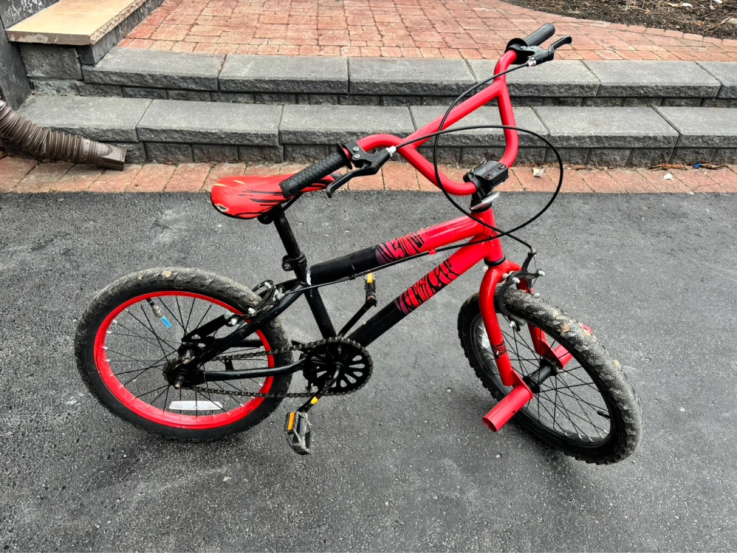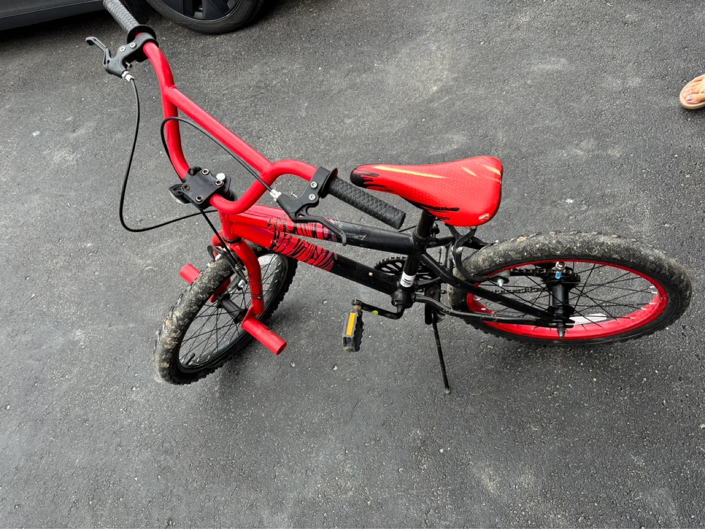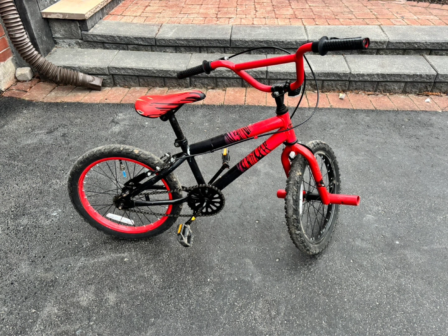 Huffy 18” bike for sale - A red and black BMX bike with stunt pegs. It's a durable ride for cruising or tricks. Perfect for kids or teens who love to ride!