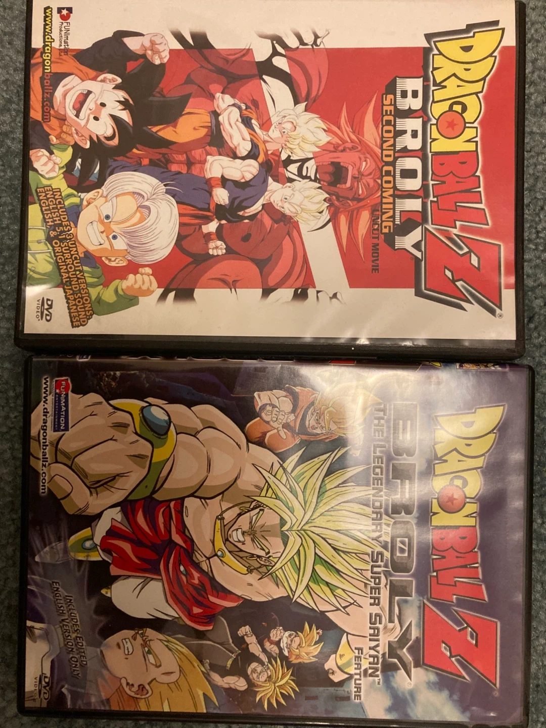 Two Dragon Ball Z DVDs featuring Broly. The first is 'Broly: Second Coming' with uncut versions, English 5.1 surround sound, and original Japanese audio. The second is 'Broly: The Legendary Super Saiyan' featuring an edited English version only. Both are from Funimation.