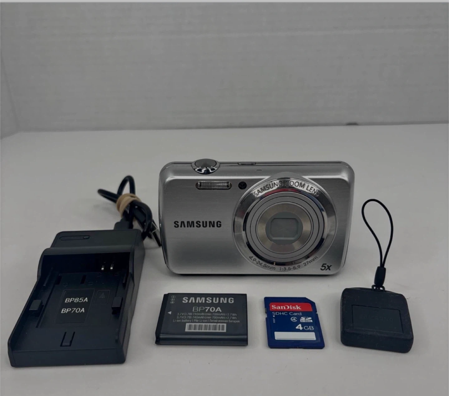 Selling a Samsung camera with zoom lens! It comes with a battery (BP70A), battery charger (BP85A/BP70A), and a 4GB SanDisk SDHC card. Perfect for someone looking for a simple point-and-shoot camera