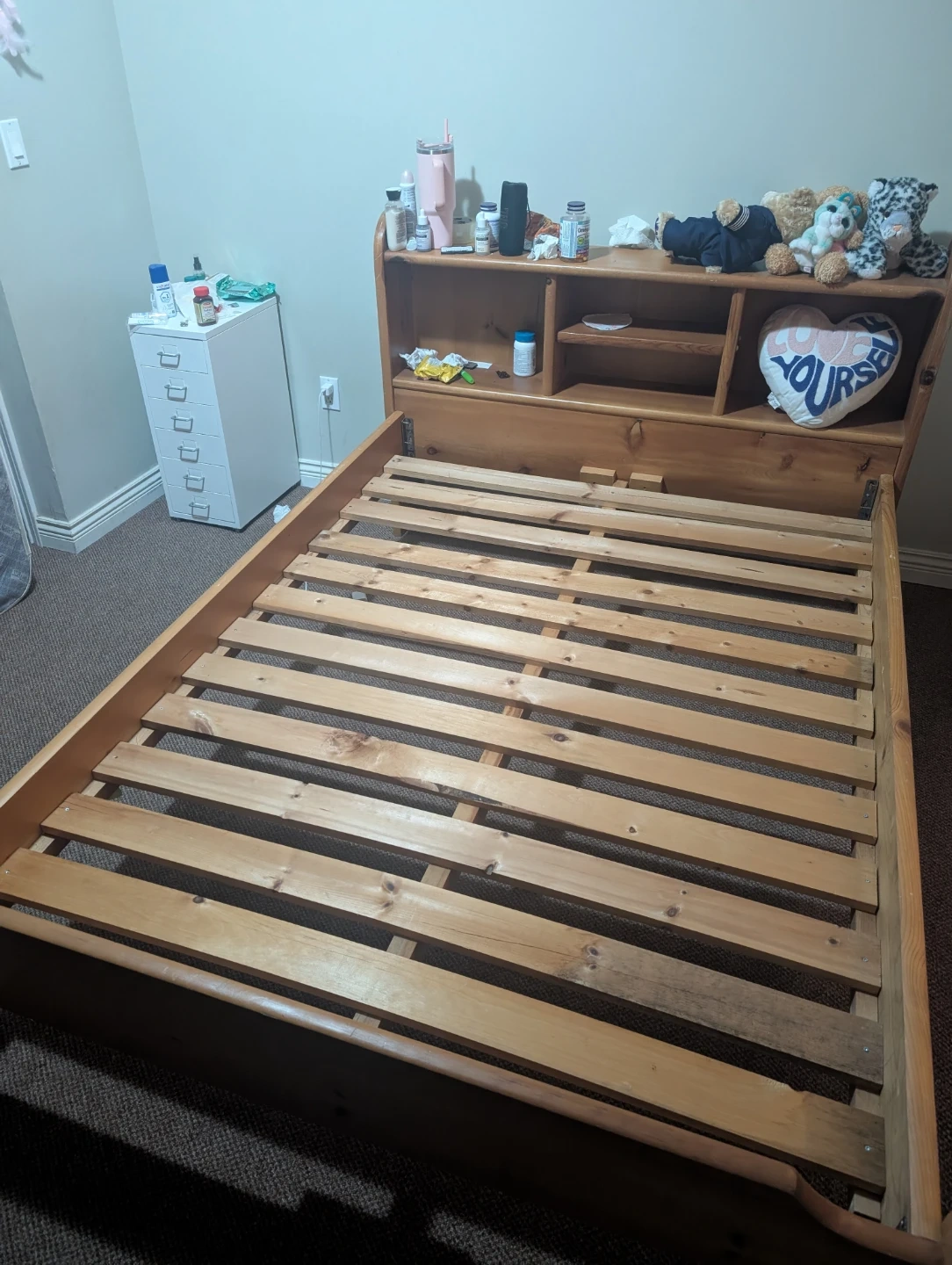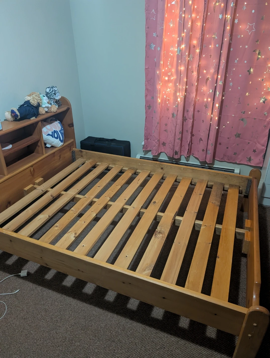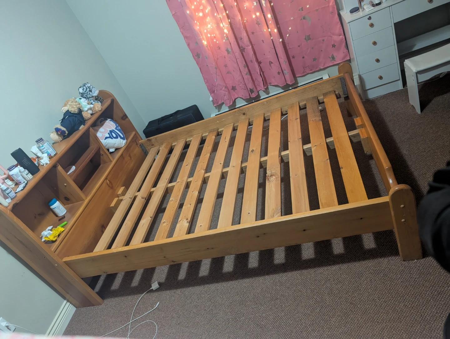 This wooden bed frame comes with a built-in headboard featuring multiple shelves for storage. It's constructed from solid wood and includes a slatted base for mattress support. This bed is suitable for a bedroom needing a practical and classic furniture piece. And is in a good condition
