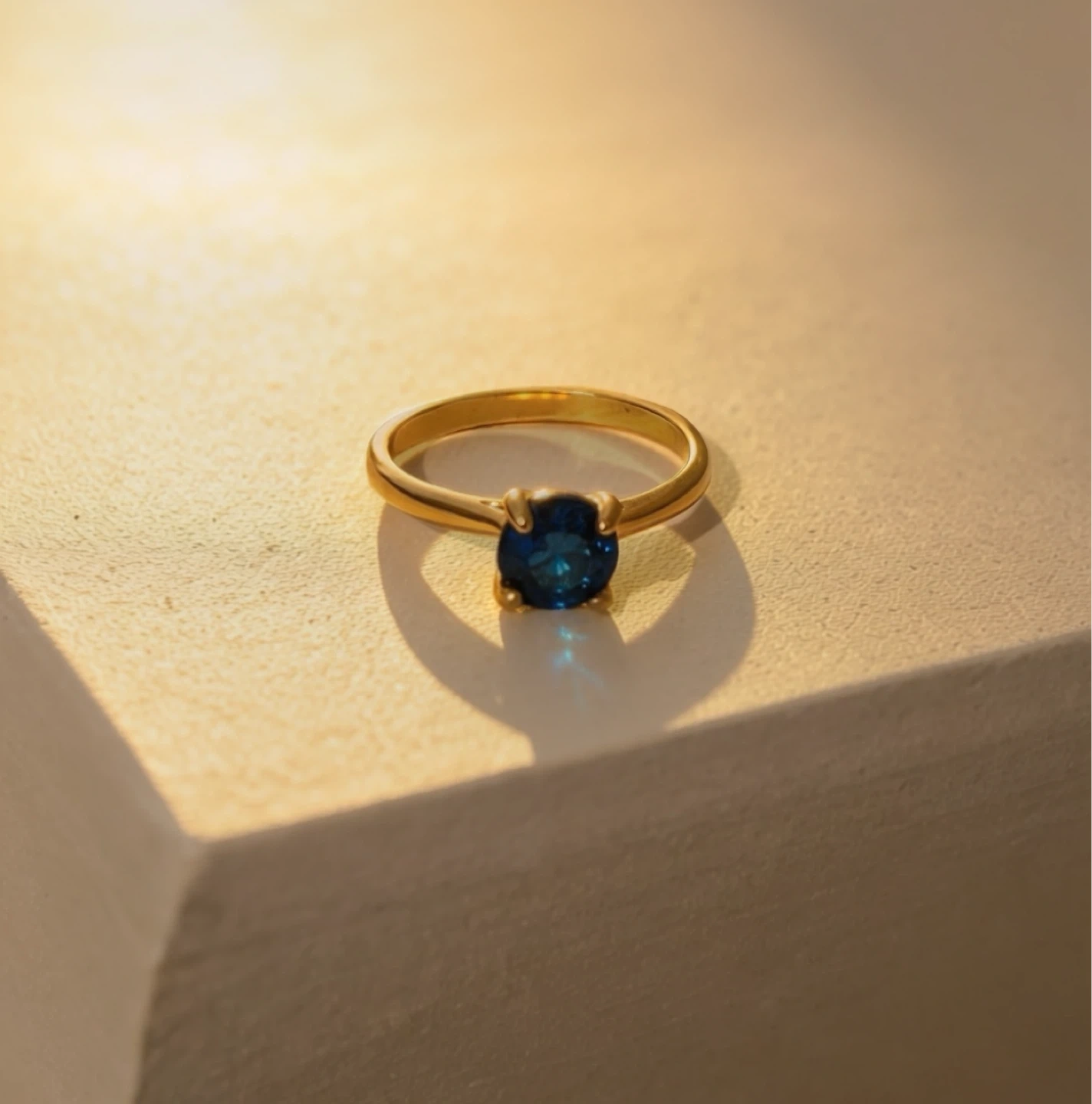 A gold-tone ring featuring a deep blue sapphire-style stone. Classic solitaire that adds a refined touch to any outfit. Comfortable band and secure four-prong setting. The deep blue color offers versatile, timeless appeal.