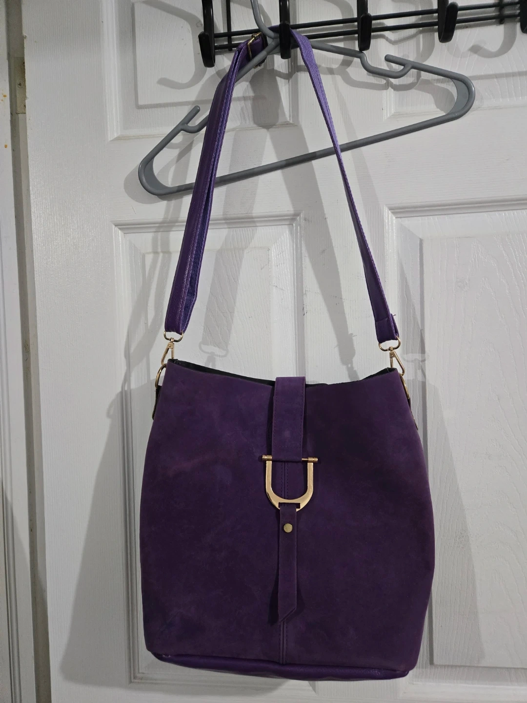 This is a stylish purple shoulder bag with a gold buckle detail. It's made from a faux suede material and has an adjustable strap. Its simple design makes it versatile for everyday use.