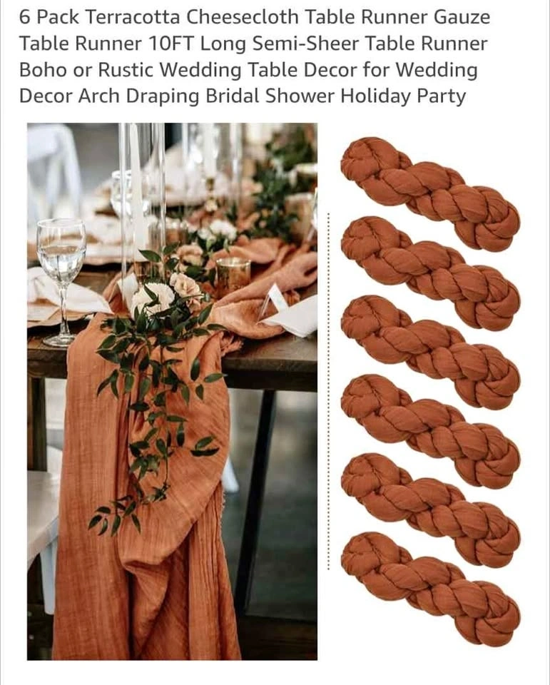 Used once at our wedding. In perfect condition. We have 18 of them. Terracotta cheesecloth table runner, 10ft long. Semi-sheer gauze runner, great for boho or rustic wedding decor, arch draping, bridal showers, or holiday parties.
