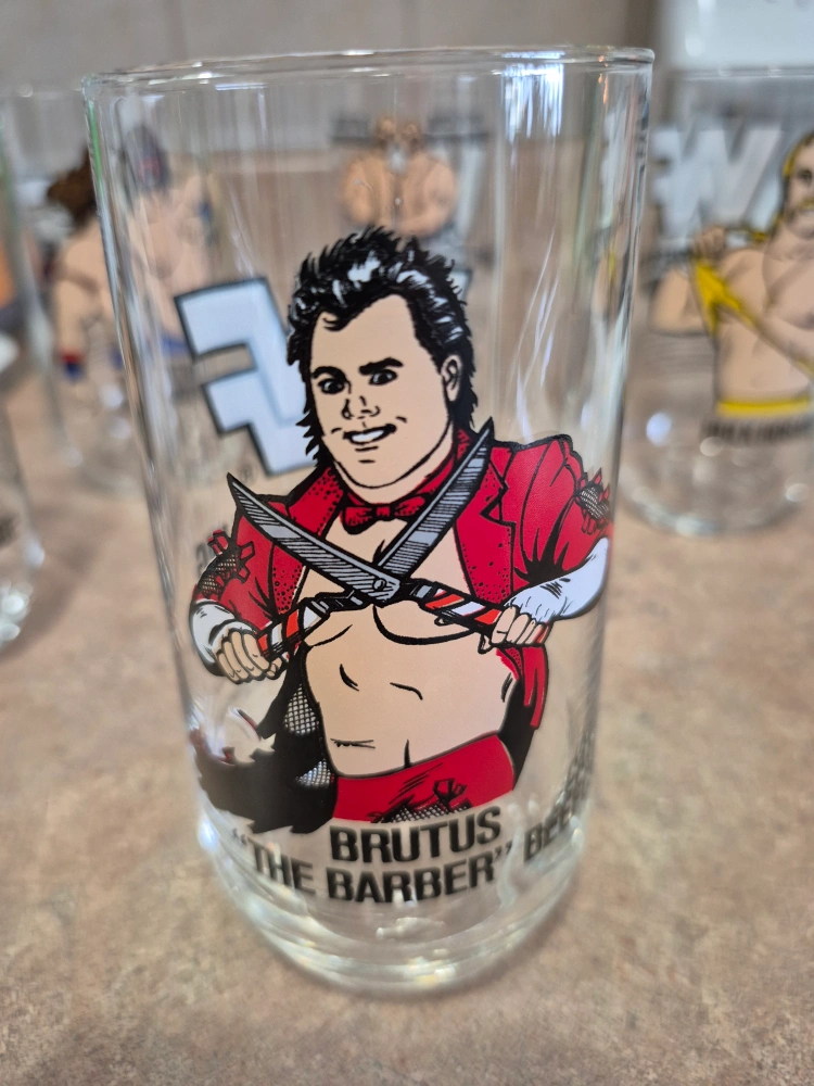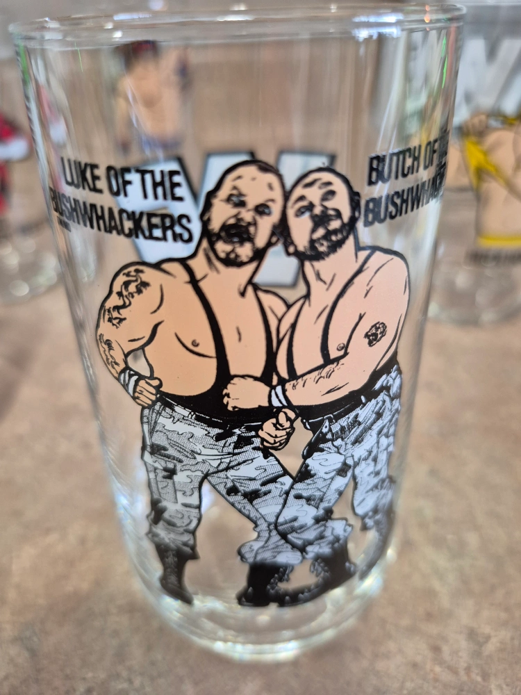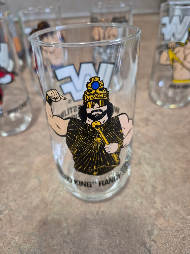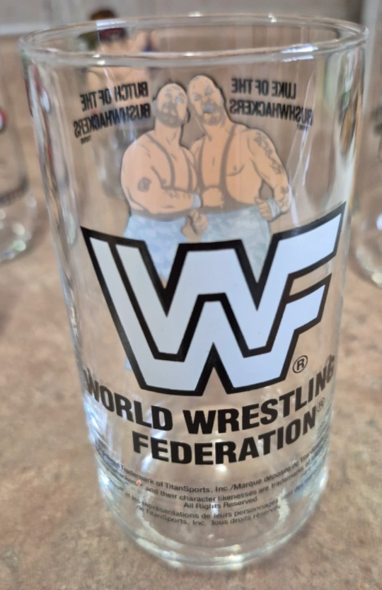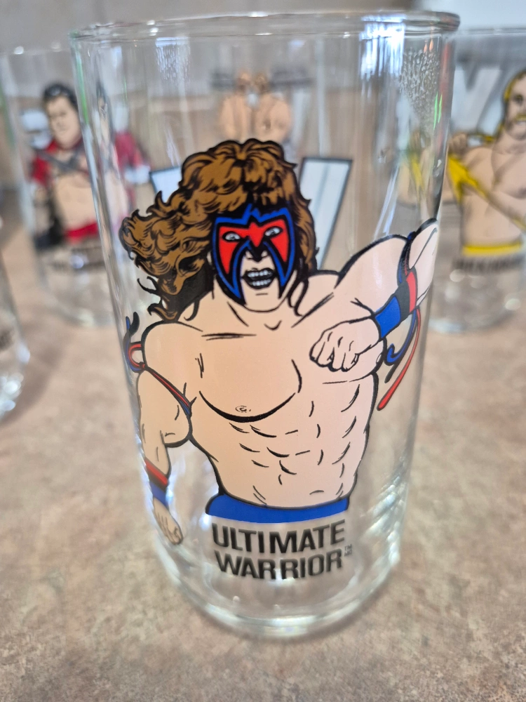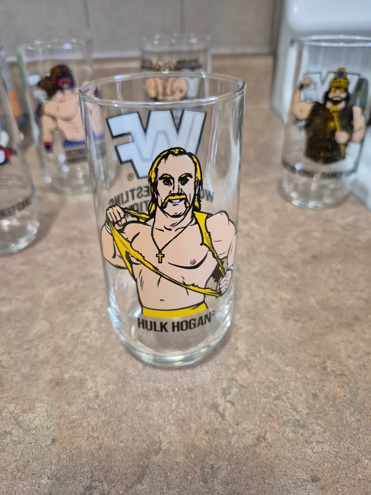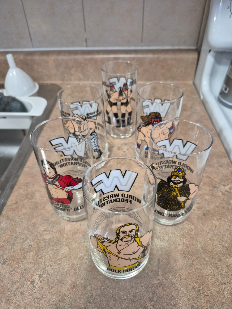 Set of six vintage World Wrestling Federation (WWF) glasses. Features iconic wrestlers: Hulk Hogan, Brutus “The Barber” Beefcake, Randy Savage, Ultimate Warrior, Demolition and The Bushwhackers. Collectible glassware. Great for wrestling fans.