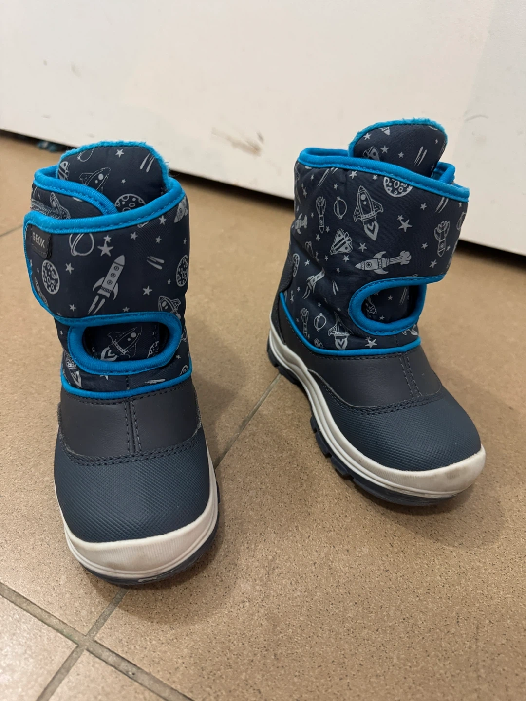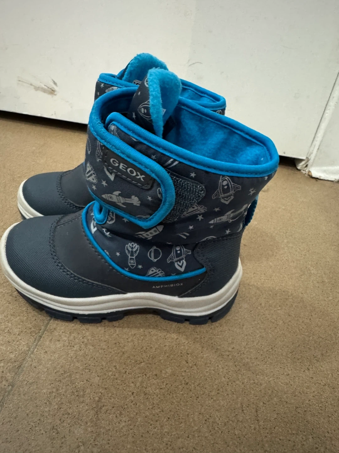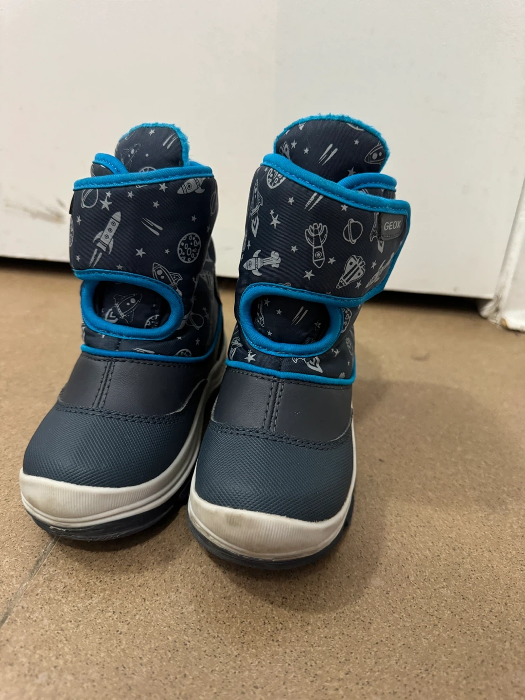 These Geox Amphibiox winter boots feature a fun space and rocket print. They have a dark grey and blue colour scheme with a hook-and-loop closure for easy on and off. The boots appear to be well-insulated for cold weather. Great for keeping little feet warm and dry during winter! size-EU(24) US(8). It is suitable for 2.5-3 years old toddlers.