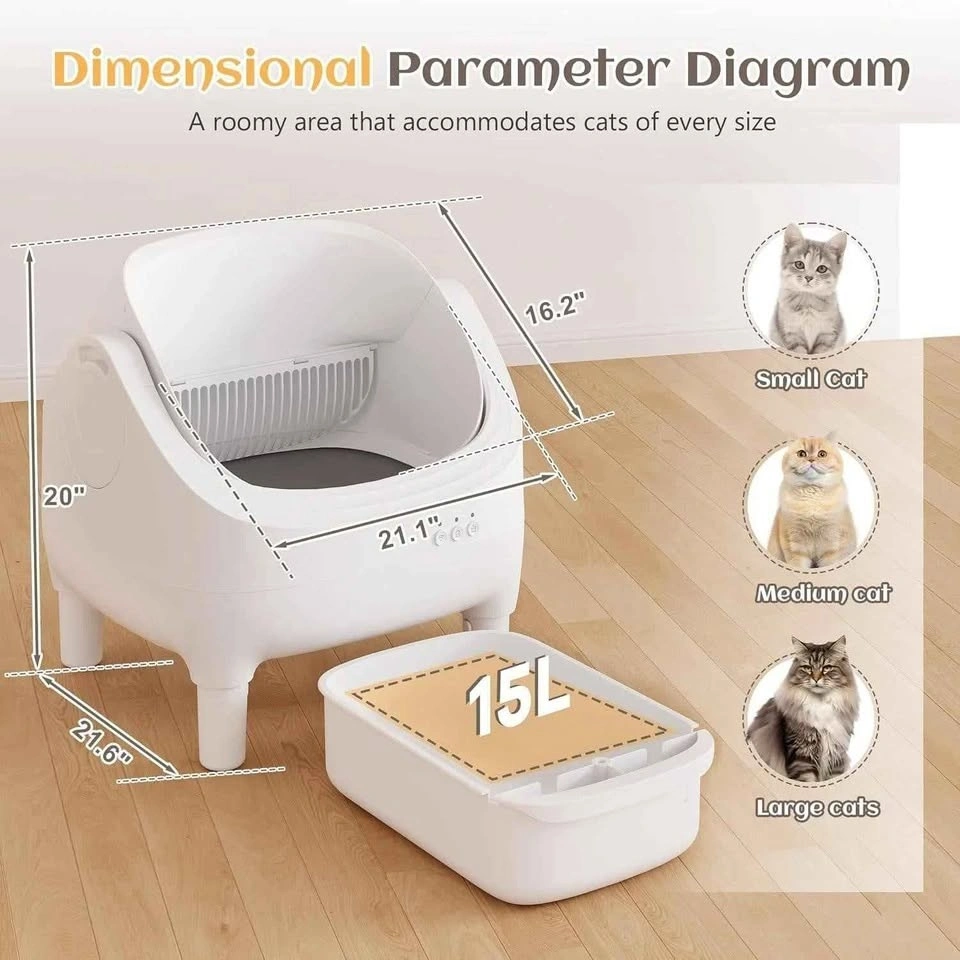 Smart automatic self-cleaning cat litter box with app control for monitoring and cleaning. Features built-in infrared and weight sensors for safety. Suitable for small, medium, and large cats. Dimensions are approximately 20" high, 21.1" wide, 16.2" deep, with a 21.6" base. Includes a 15L waste bin. Compatible with various litter types like tofu, bentonite, spherical, and crushed litter. Very convenient for cat owners!