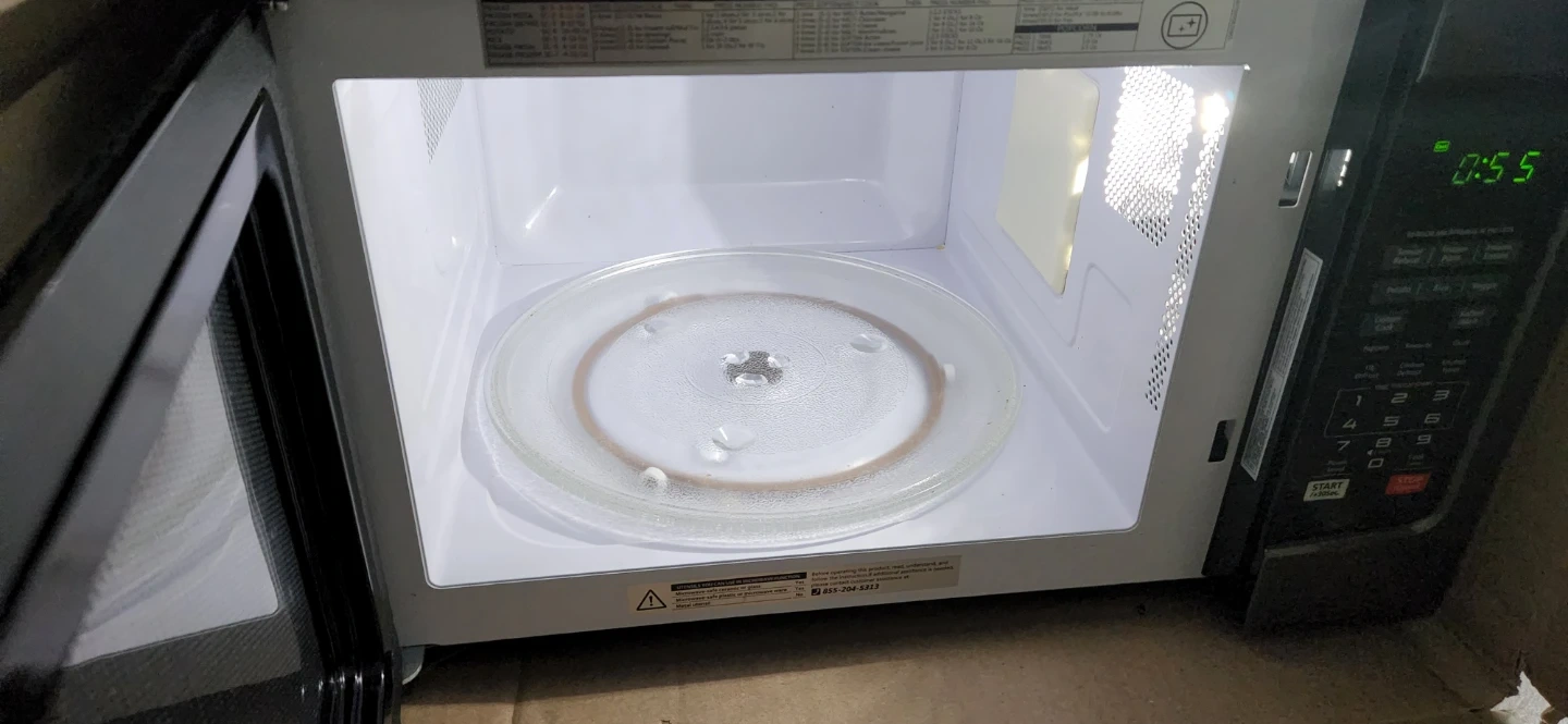 Almost new.This is a Toshiba microwave oven. It has a digital display and a turntable. Includes original box and packaging.1550w.cash only