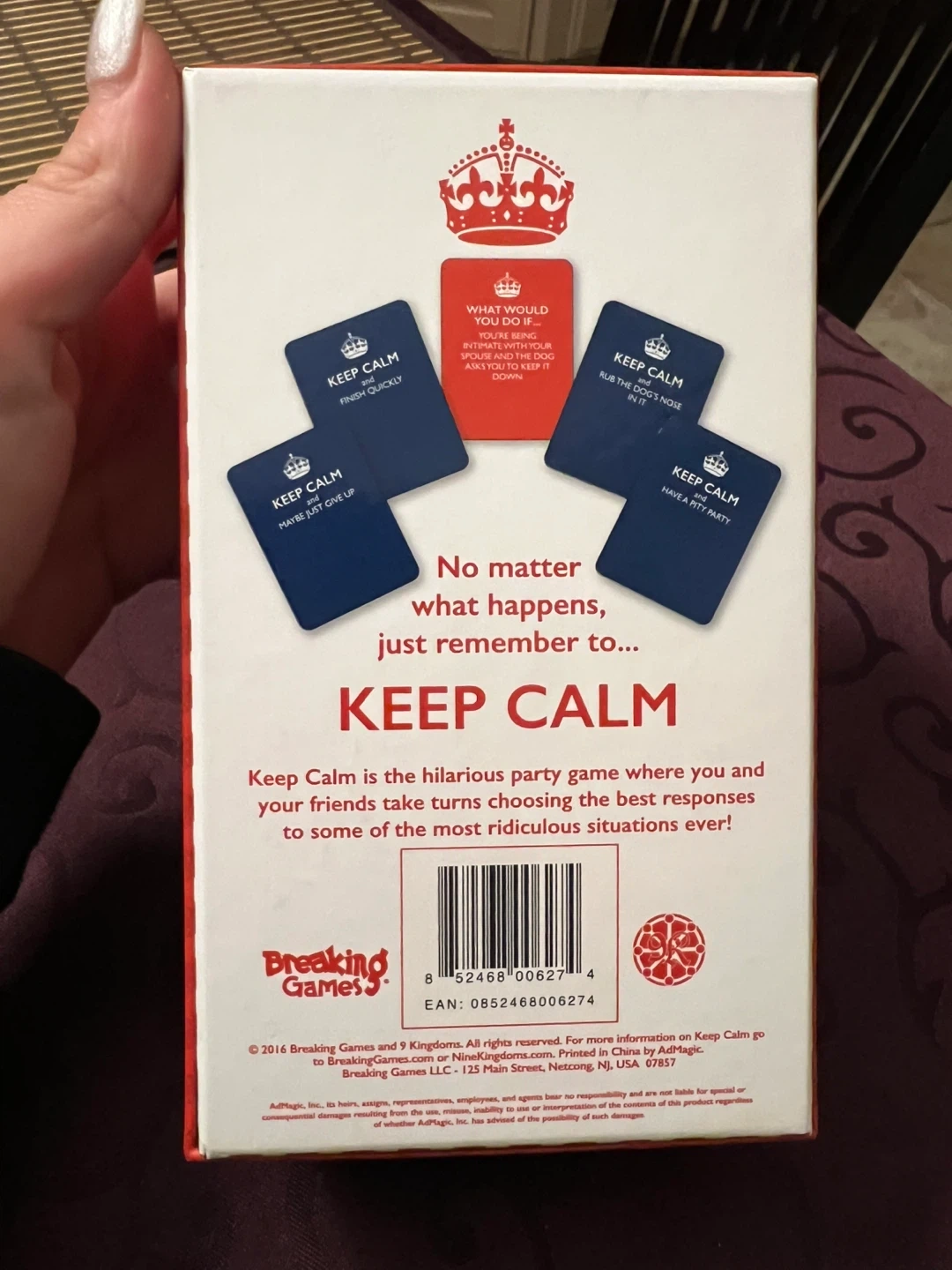 Keep Calm is the hilarious party game where you and your friends take turns choosing the best responses to some of the most ridiculous situations ever! Recommended for ages 18+, 3-8 players, and takes about 30 minutes to play