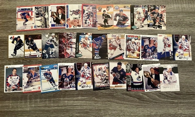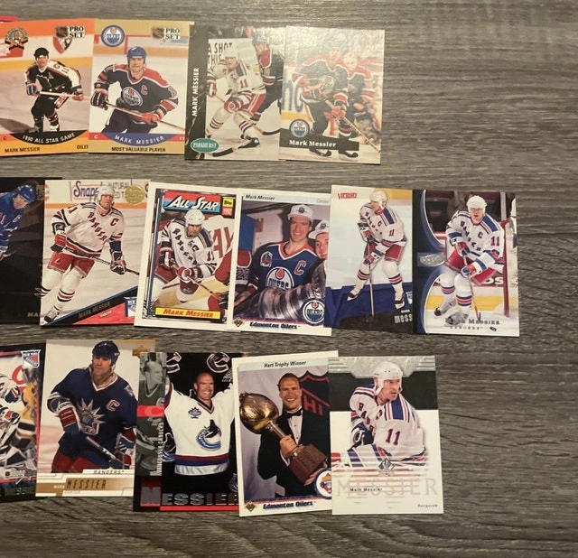 Get your hands on this lot of 25+ Mark Messier hockey cards! This is a used collection featuring various cards from different years and teams, celebrating the iconic career of the hockey legend. These cards are perfect for any hockey collector or Oilers/Rangers/Canucks fan. Don't miss out on the chance to own a piece of hockey history! While I'm not entirely sure if Gretzky borrowed Messier's number 11 jersey for a game, I can assure you that these cards are available if the ad is still up!