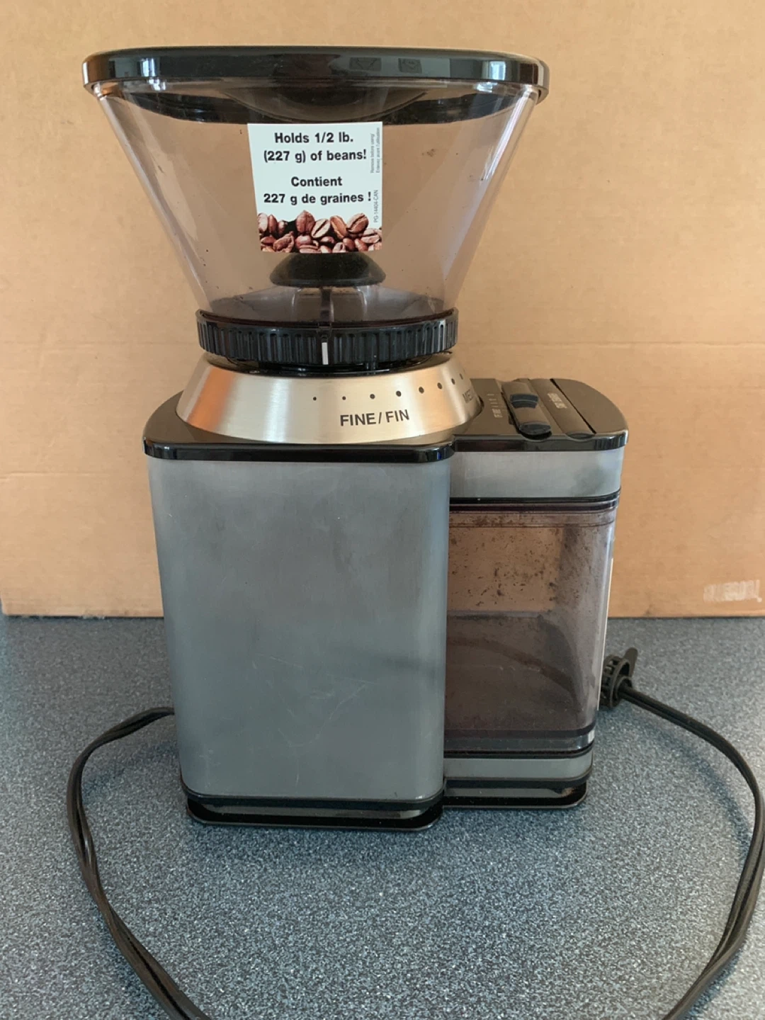 This Cuisinart coffee grinder features an automatic burr mill. It offers multiple grind settings from fine to coarse. The unit holds up to 1/2 lb. (227 g) of beans.