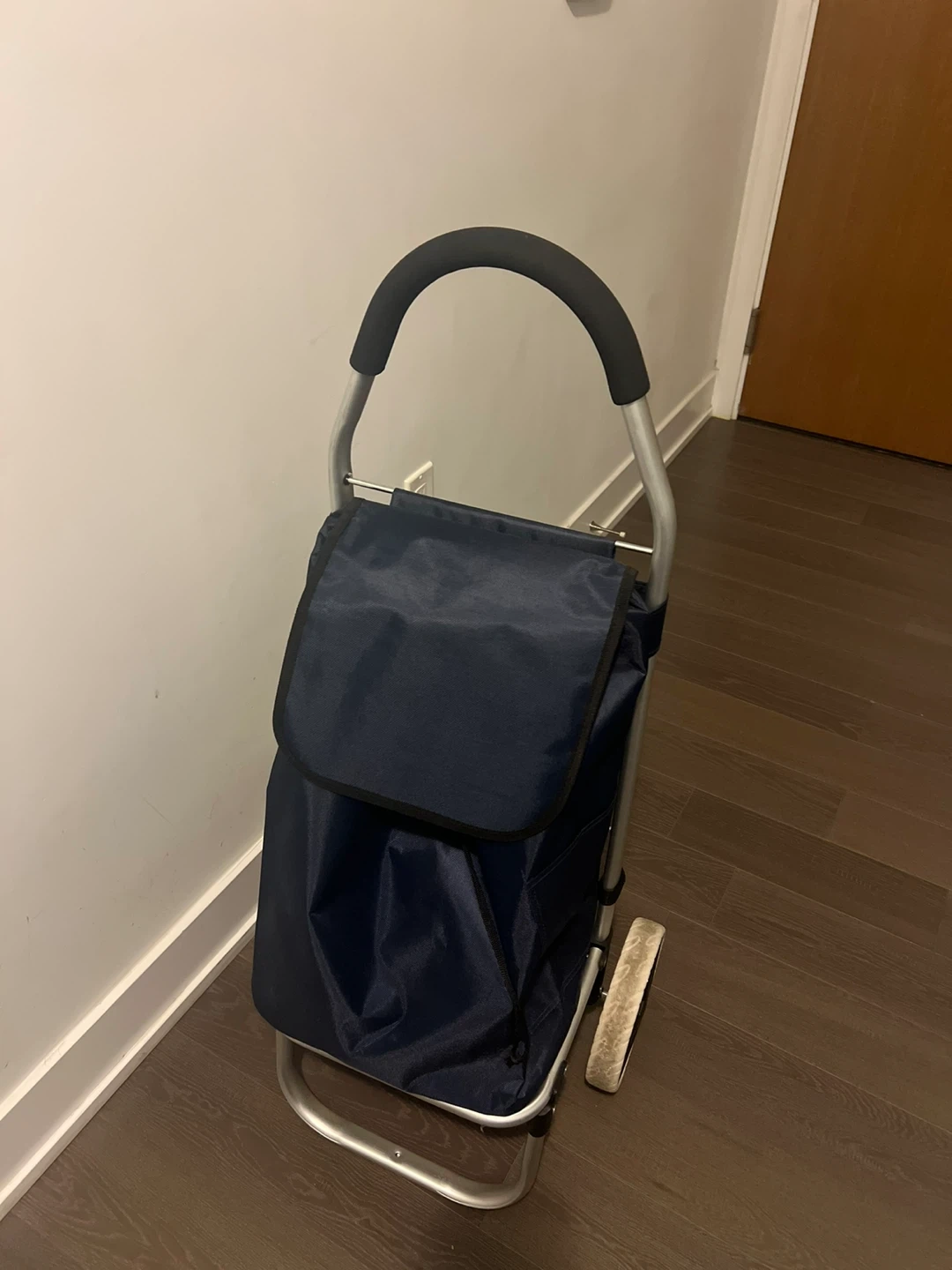 This navy blue rolling shopping cart makes errands easy. It features a durable frame and a spacious bag for groceries or supplies. The wheels provide smooth transport for your belongings.