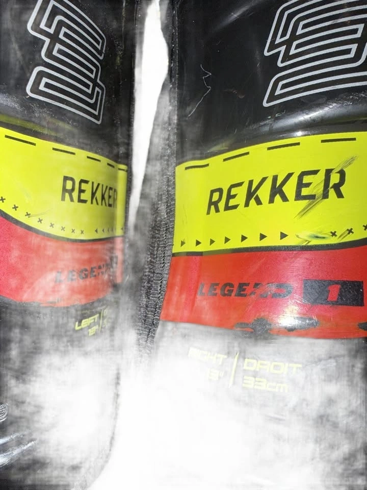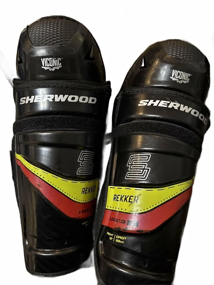 Pair of Sherwood Rekker hockey shin guards designed for protection and comfort during play. Features adjustable straps for a secure fit and durable outer shell to withstand impacts. Suitable for left and right leg with size 13". Ideal for hockey players seeking reliable lower leg protection.