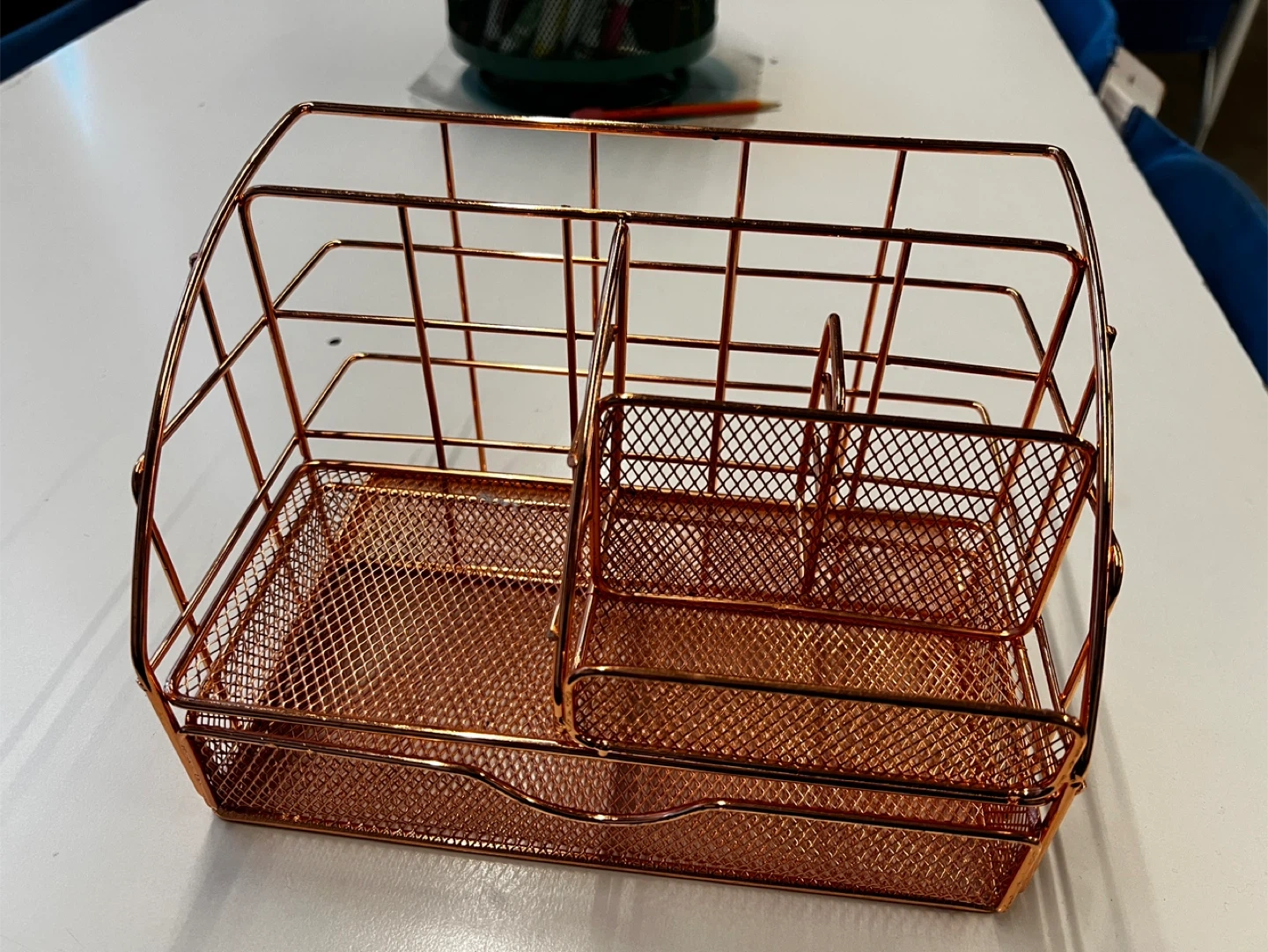 Declutter your workspace with this stylish rose gold wire desk organizer! It's perfect for keeping pens, pencils, and other office supplies neat and tidy. The mesh design adds a modern touch to any desk