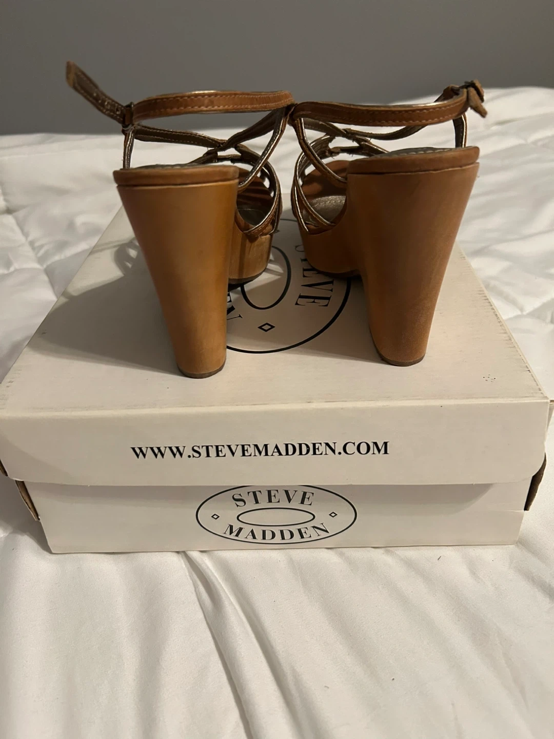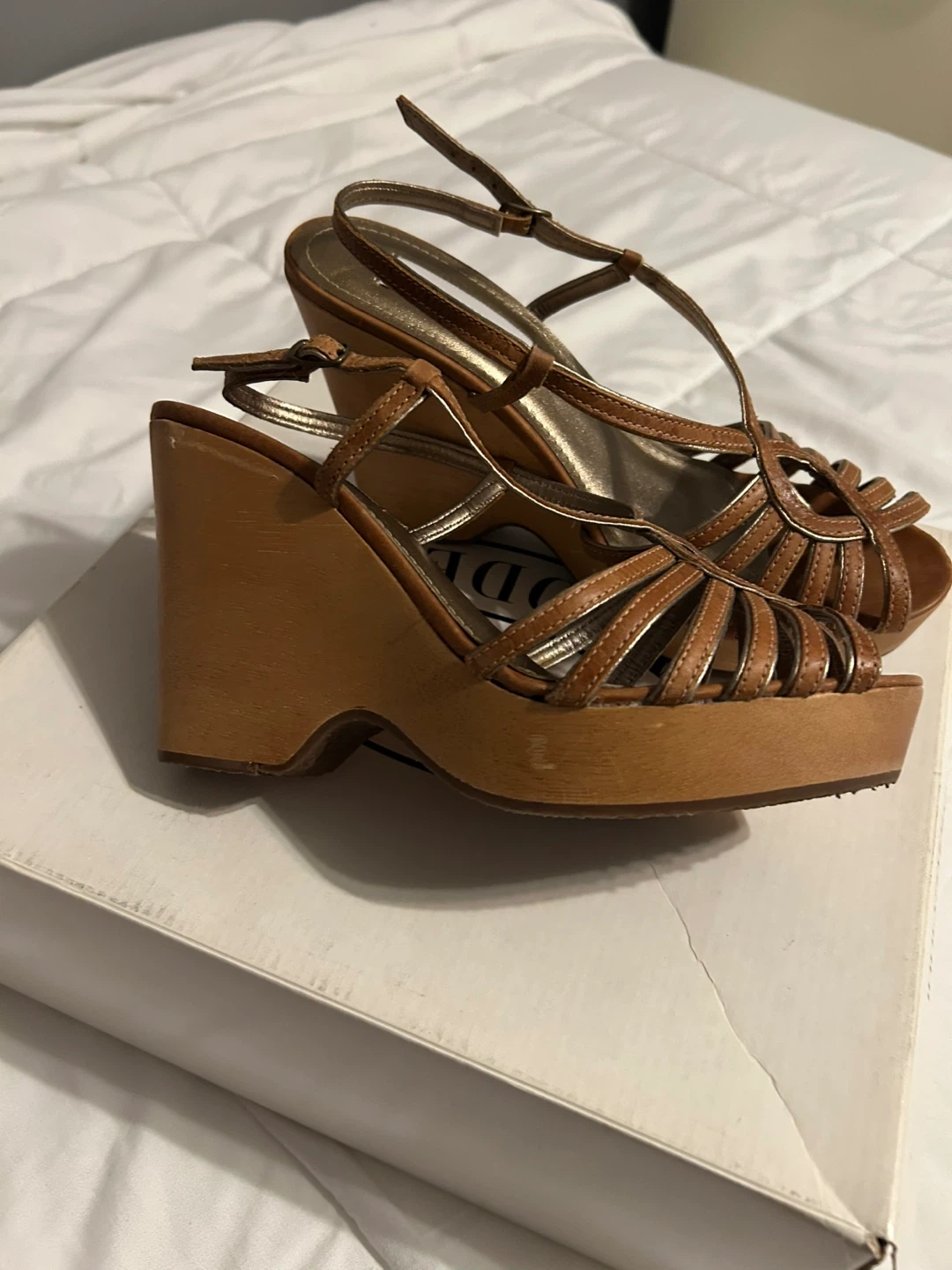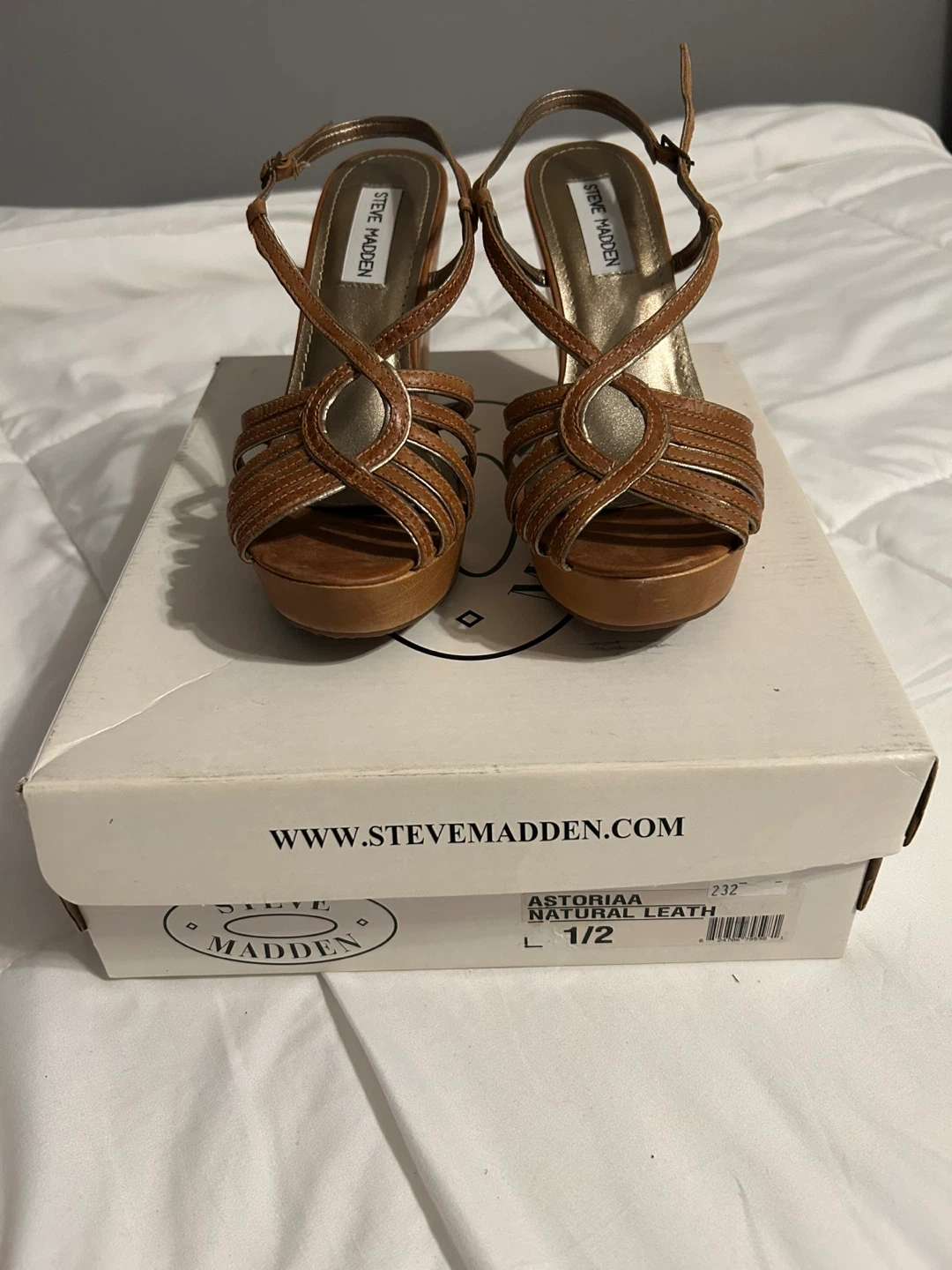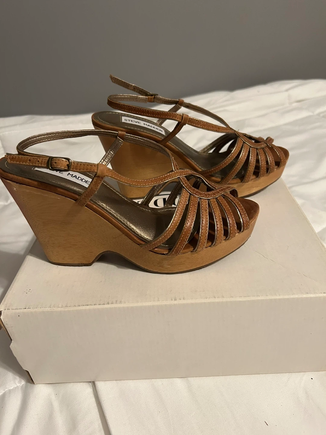 Vintage Y2K Steve Madden Astoriaa Tan Leather & Wood Wedge Sandals with Gold. Tan wedges with strappy design. Size is not marked and torn off box but they fit me - a size 6.5. These are in excellent vintage condition with no obvious wear on bottom and only minor scuff on side noted in picture. These are rare being in like new condition!