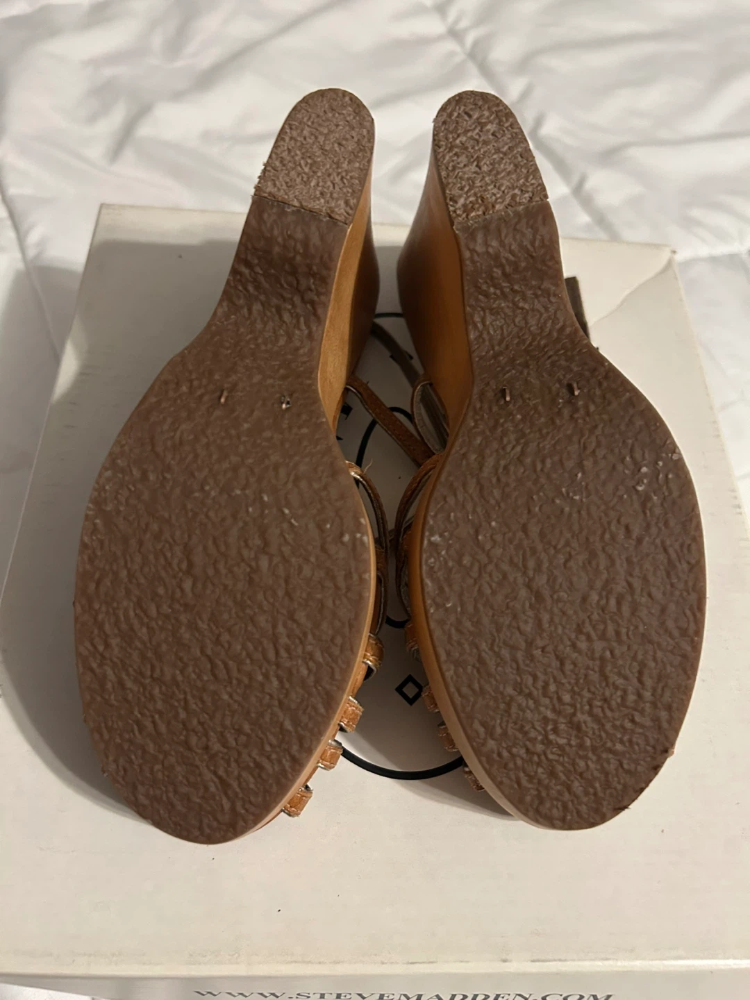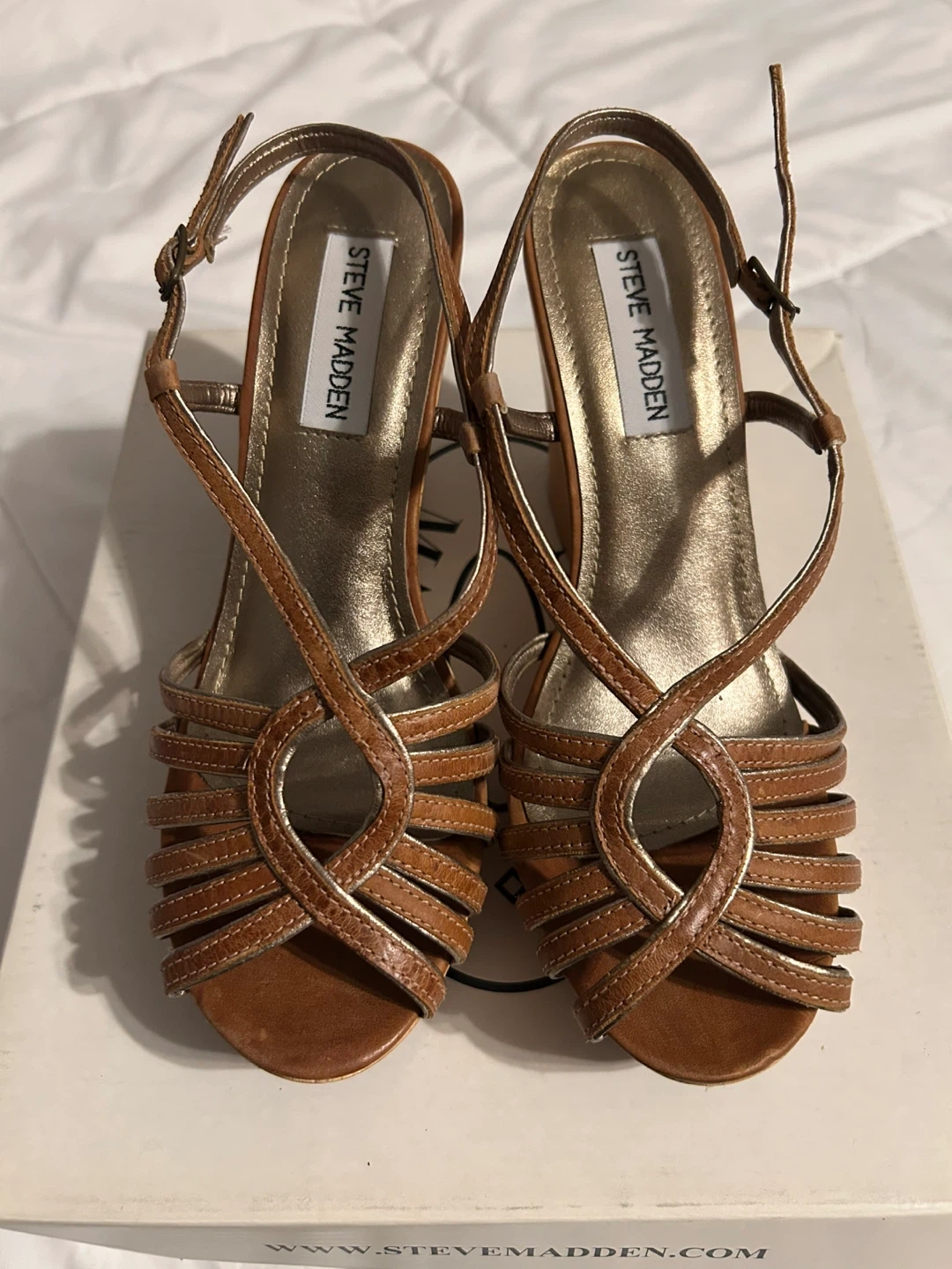 VTG Y2K Steve Madden Astoriaa Tan Leather & Wood Wedge Sandals