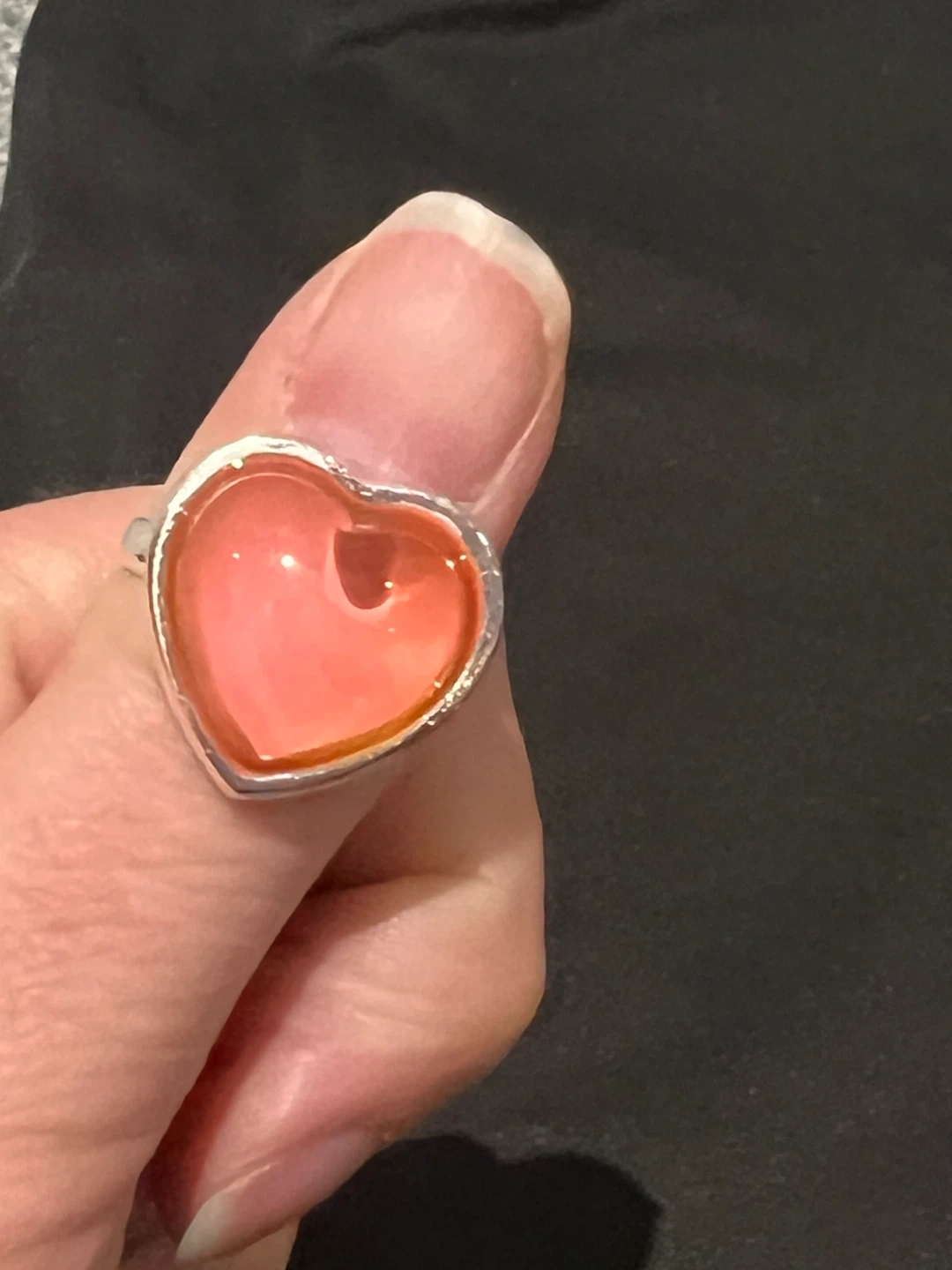 This is a fun heart-shaped ring with a vibrant pink stone. The band is silver-toned. It's a unique accessory that adds a pop of colour to any outfit. It's a great statement piece for casual wear!