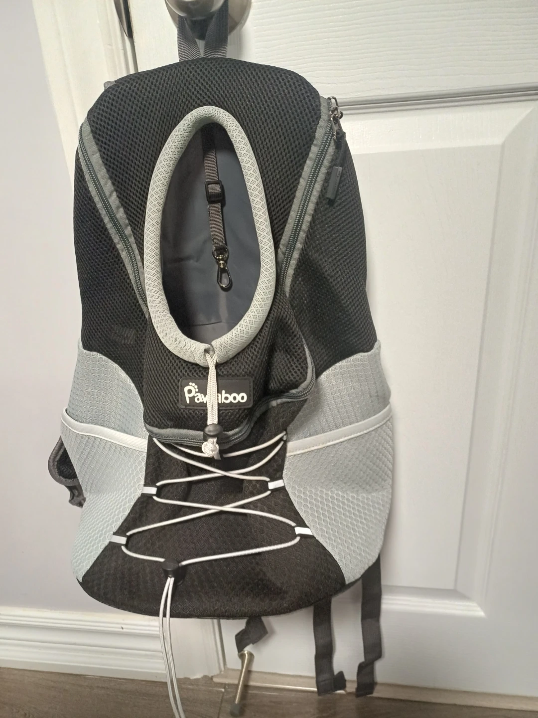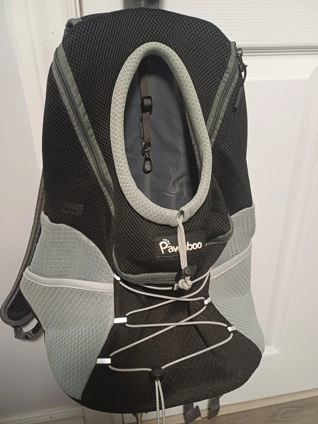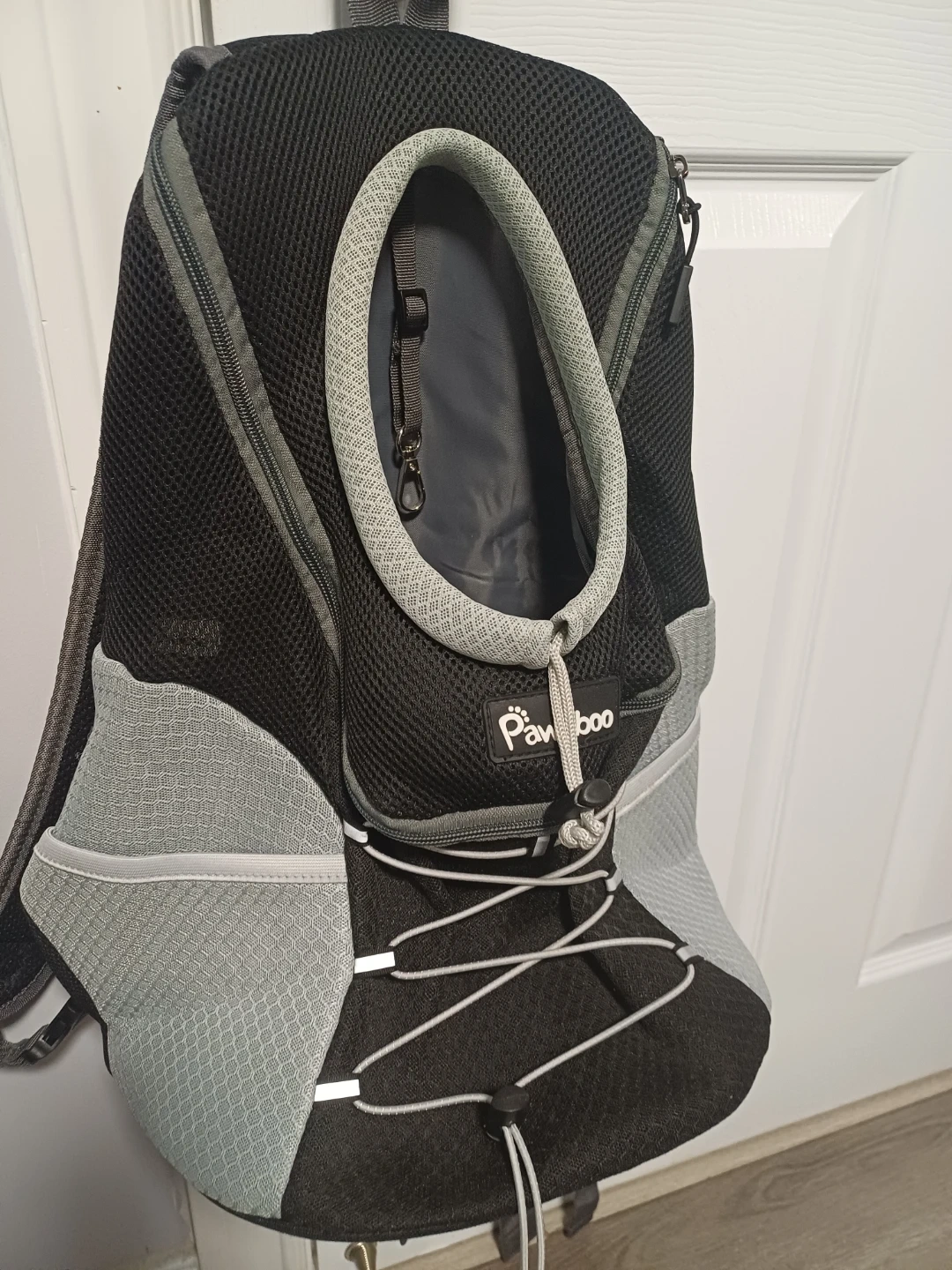 This Pawaboo backpack carrier is designed for dogs and cats. It features a mesh design for ventilation and adjustable straps for comfort. Includes a safety leash clip inside and a padded bottom for your pet. Great for travel or walks!
