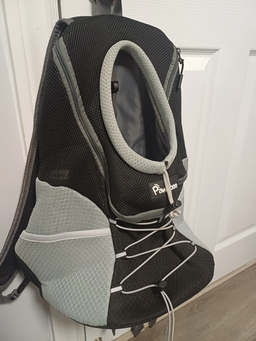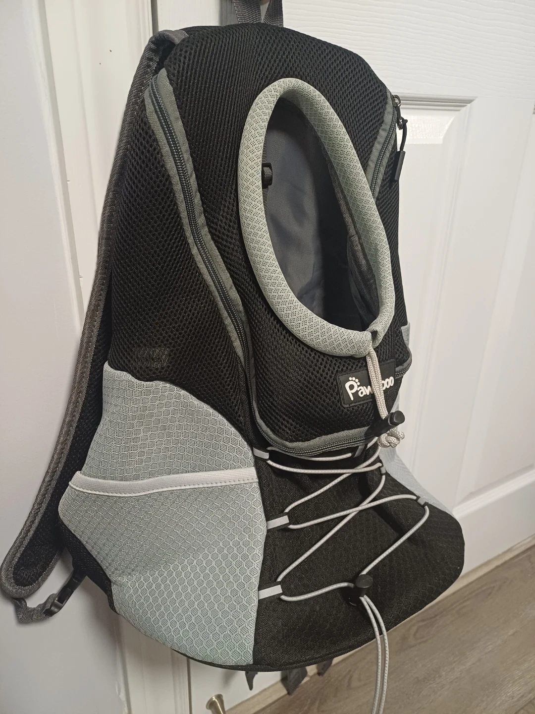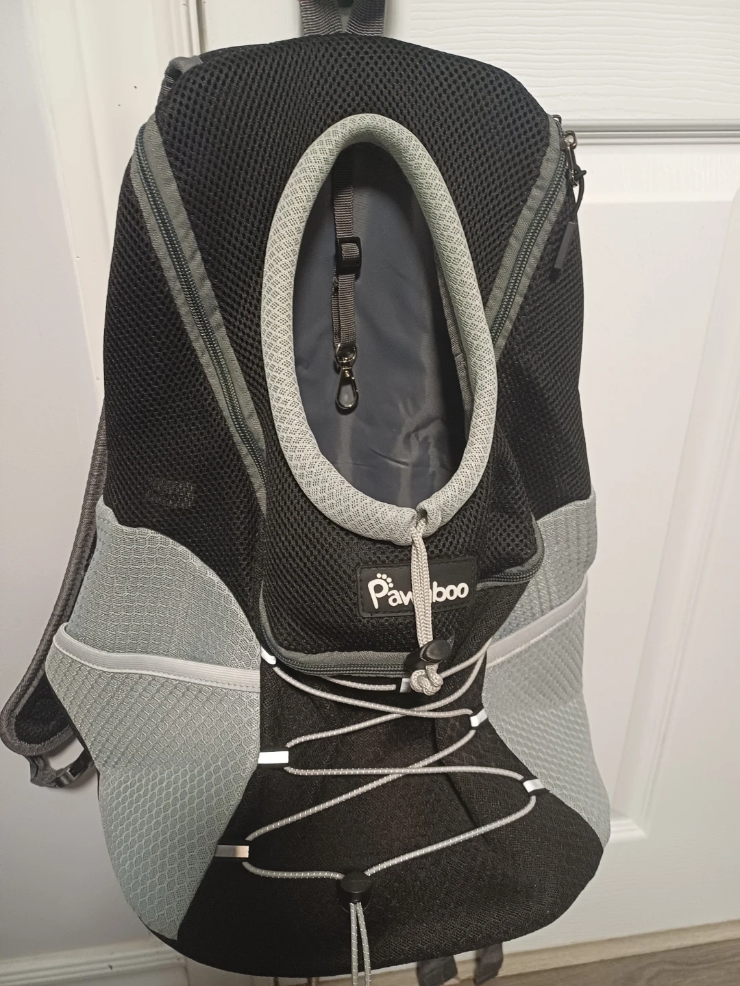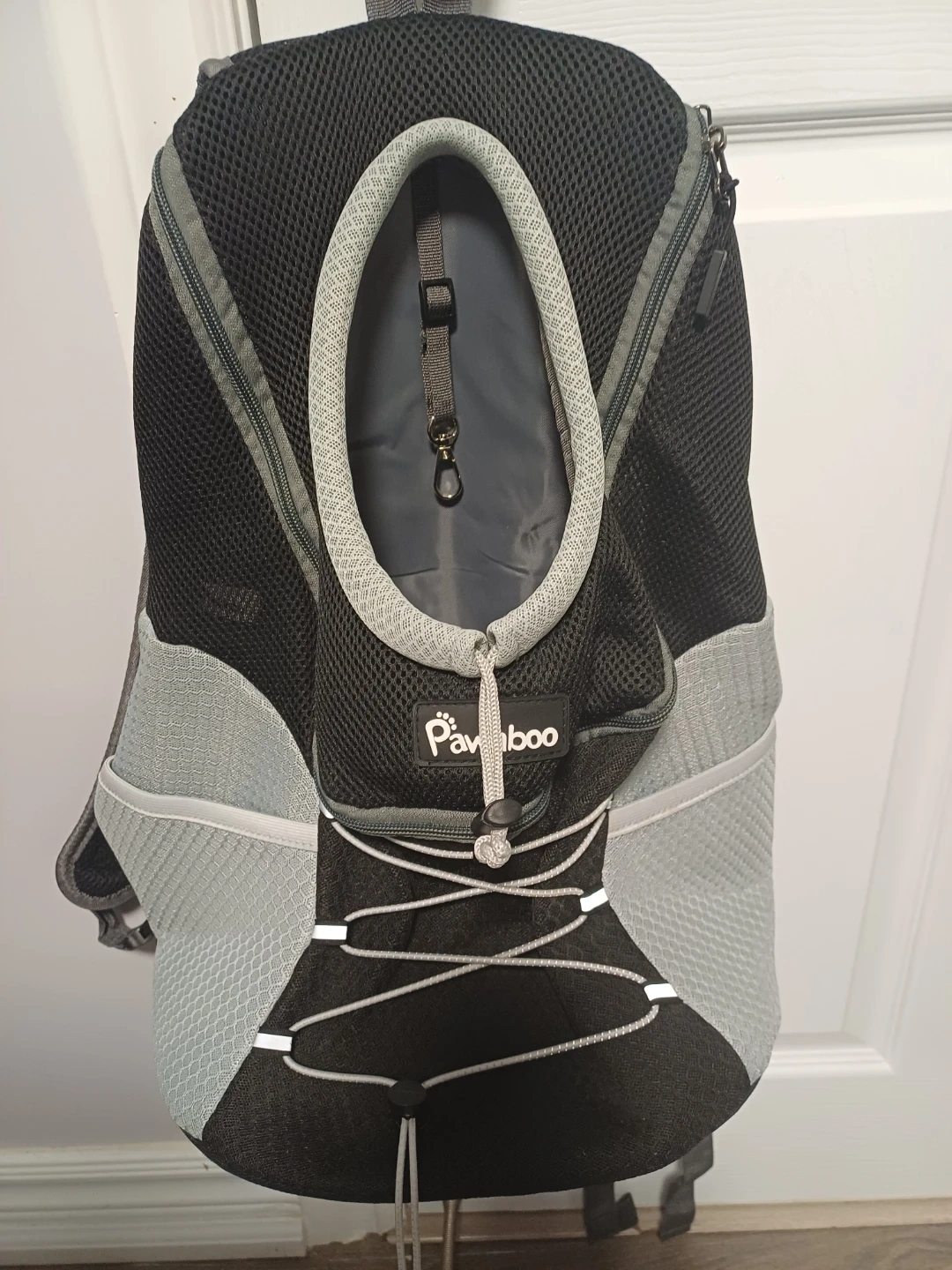 This Pawaboo backpack carrier is designed for dogs and cats. It features a mesh design for ventilation and adjustable straps for comfort. Includes a safety leash clip inside and a padded bottom for your pet. Great for travel or walks!