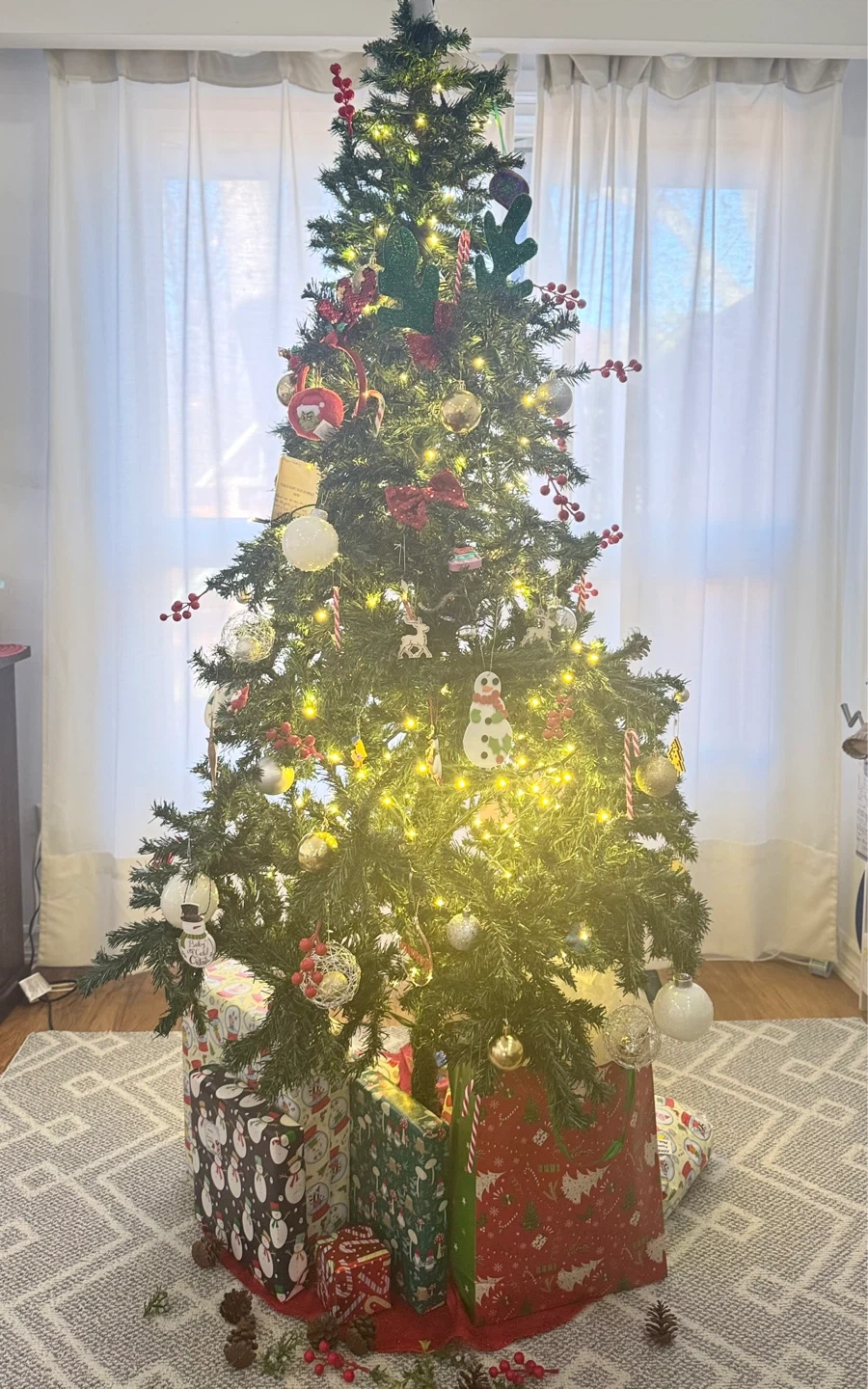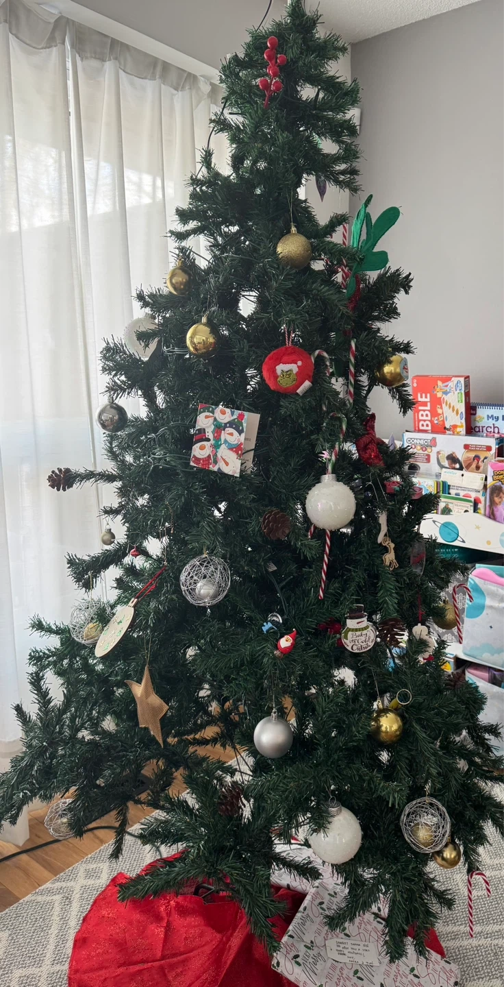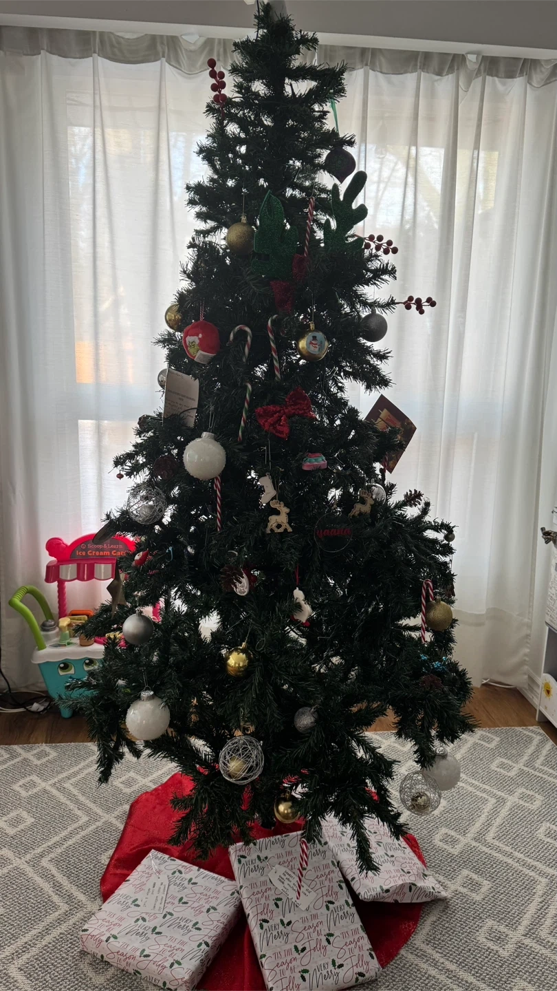Selling 7ft Christmas tree with 2 NOMA Constant-Lit Warm White Cluster Lights, along with the ornaments and other things like red cherries, pine cones that go well with the tree.