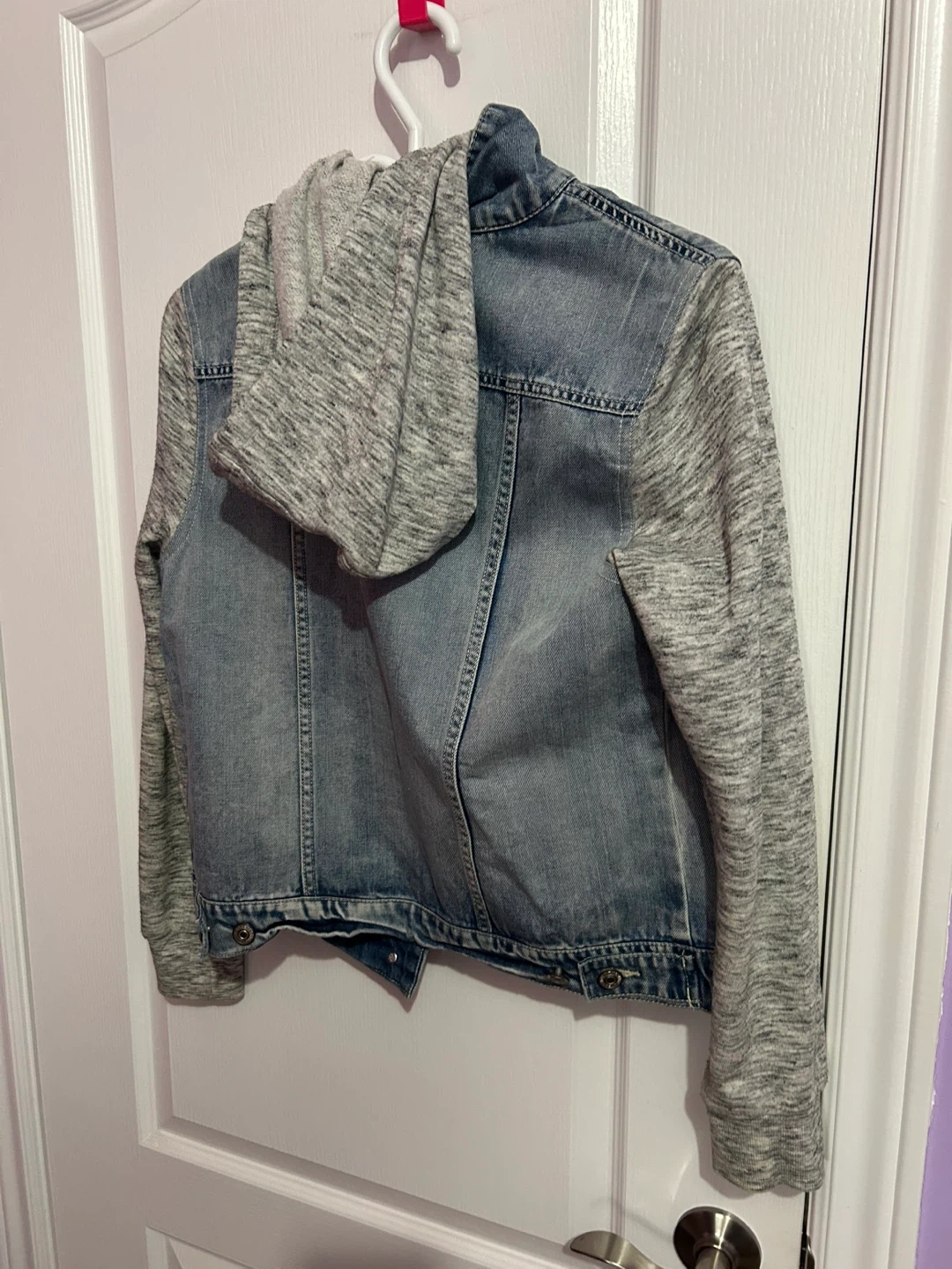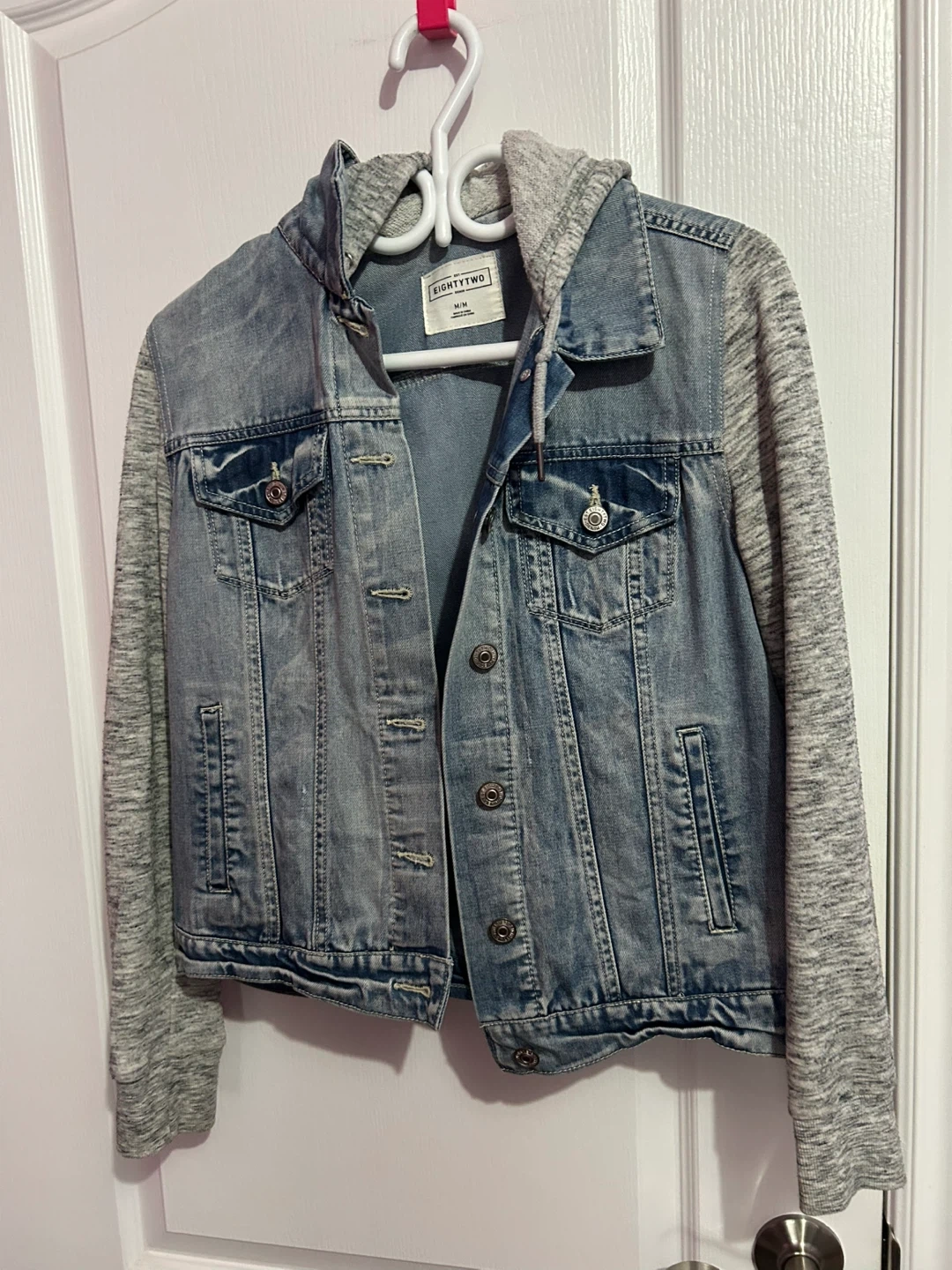 Here's a stylish denim jacket from Eighty Two, perfect for adding a bit of edge to your outfit! It features a hood and is a size M/M. The jacket has a classic denim look with contrasting grey sleeves and hood, making it a versatile piece for your wardrobe