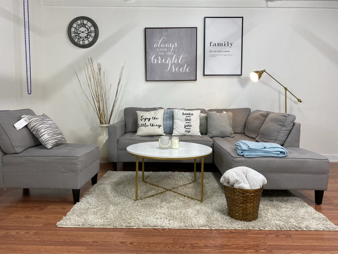 Comfortable gray fabric sectional with three separate pieces. This set has a modern design with clean lines and dark tapered legs. You can make it one sectional all pieces together. It is upholstered in a durable woven gray material. Delivery is available for this item.