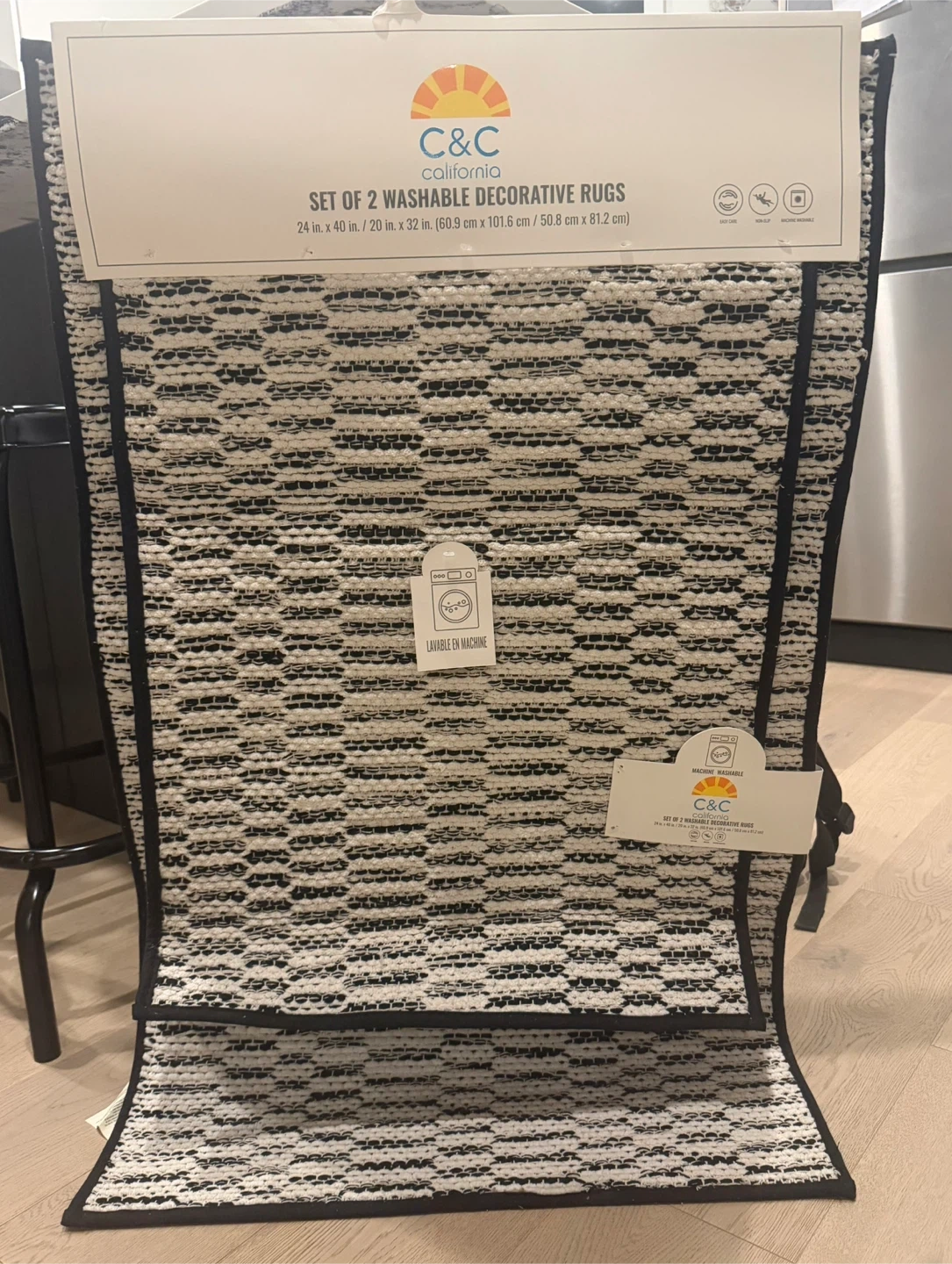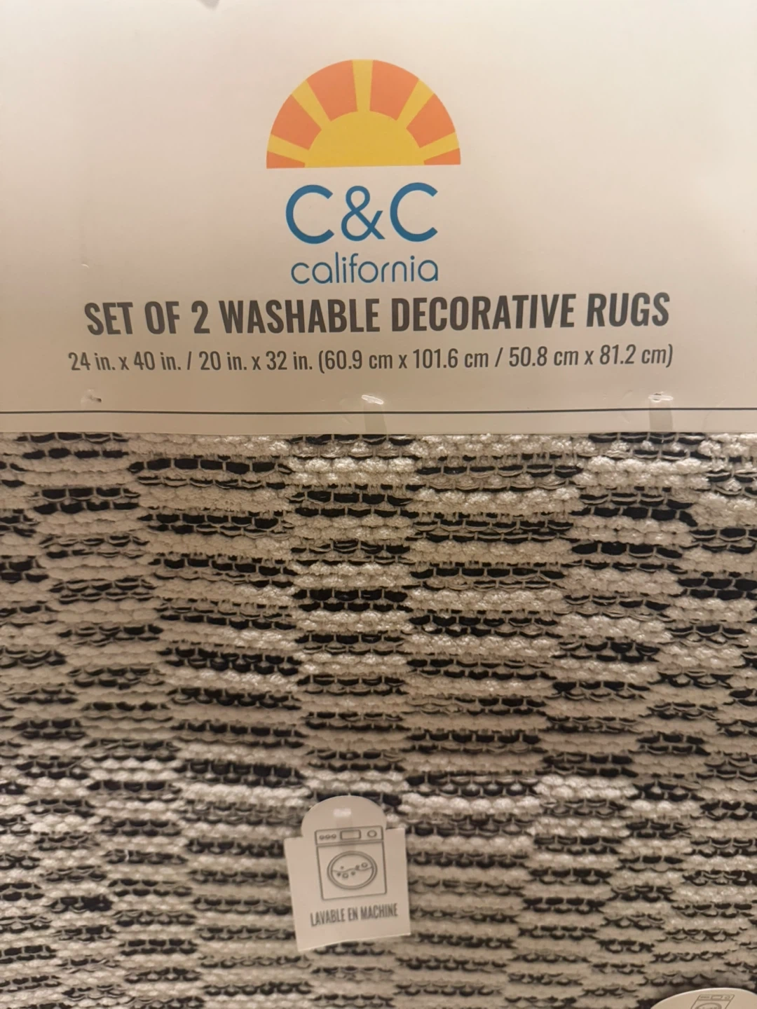Selling a set of two C&C California washable decorative rugs! One rug measures 24 inches by 40 inches (60.9 cm x 101.6 cm), and the other is 20 inches by 32 inches (50.8 cm x 81.2 cm). They're machine washable for easy cleaning