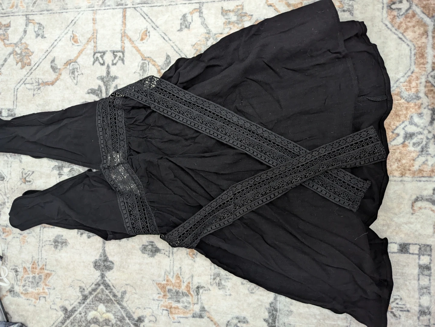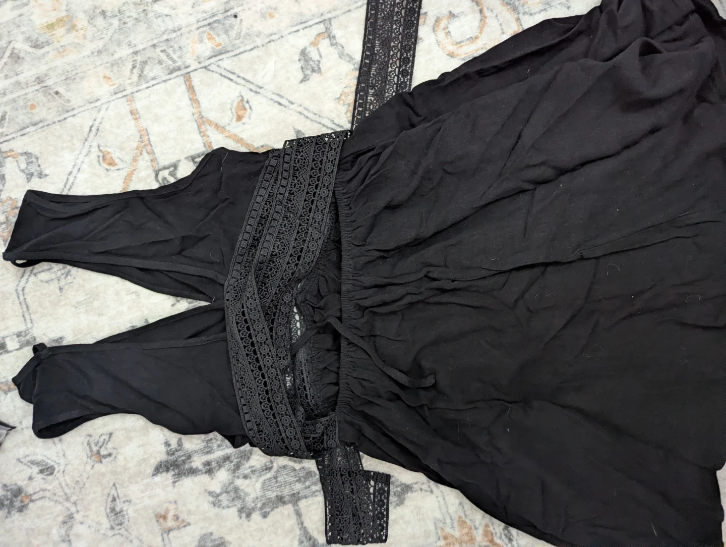 Black maxi dress with adjustable lace tie back and decorative lace trim. This dress is made from a soft, flowing fabric. It's a great option for warmer weather!