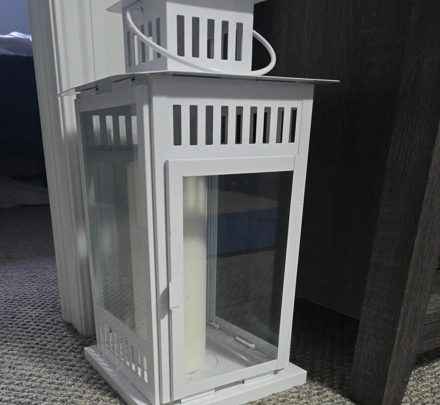This is a white metal lantern with glass panels and a tall pillar candle inside. It's designed to hold a candle for ambient lighting. This lantern would look nice on a porch or as a decorative accent indoors.