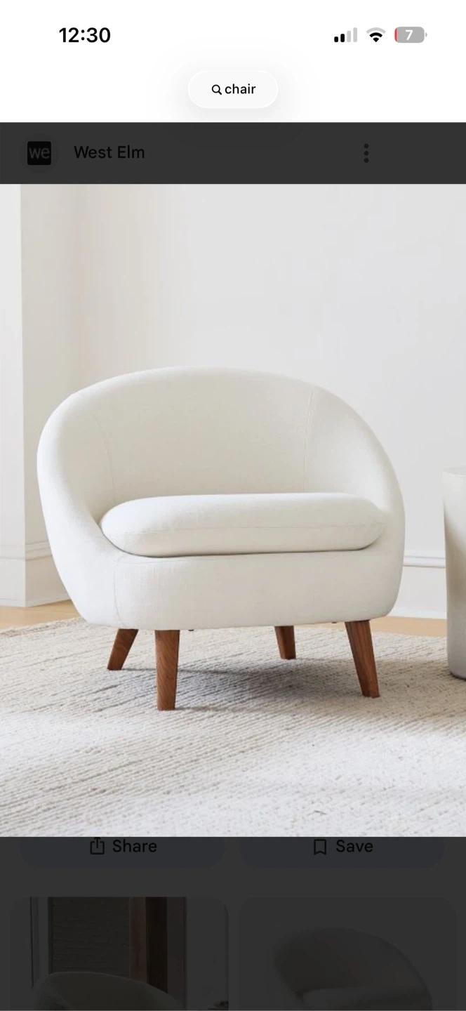 Comfortable accent chair upholstered in a cream fabric. It features a curved back and wooden legs for a modern look. This chair's cozy design makes it a nice addition to any living space.
