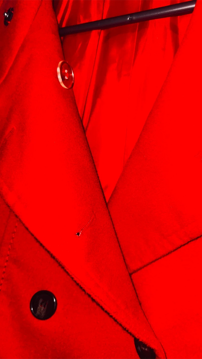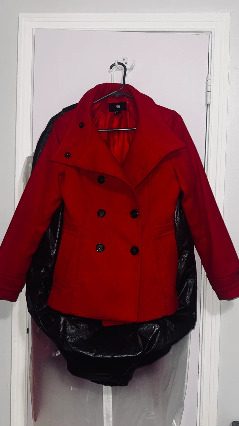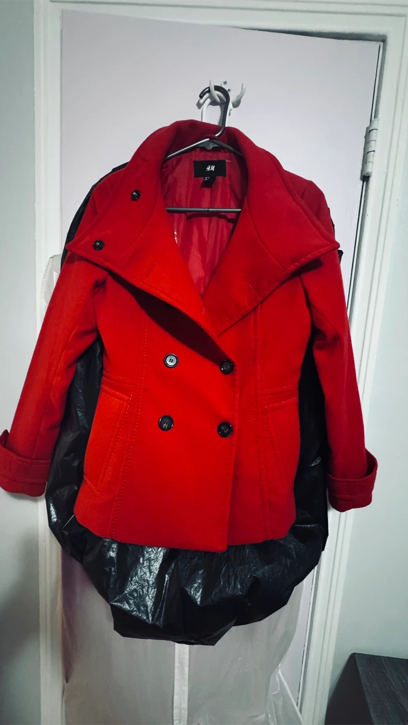 This H&M pea coat comes in a vibrant red colour. It's a double-breasted style with dark buttons. Made in China. A great coat for cooler weather!