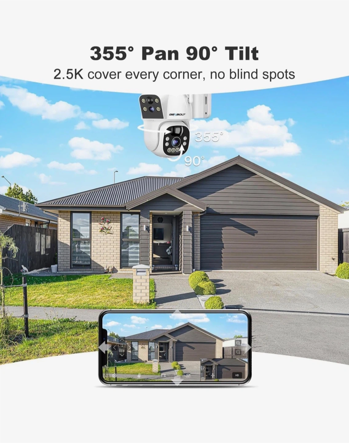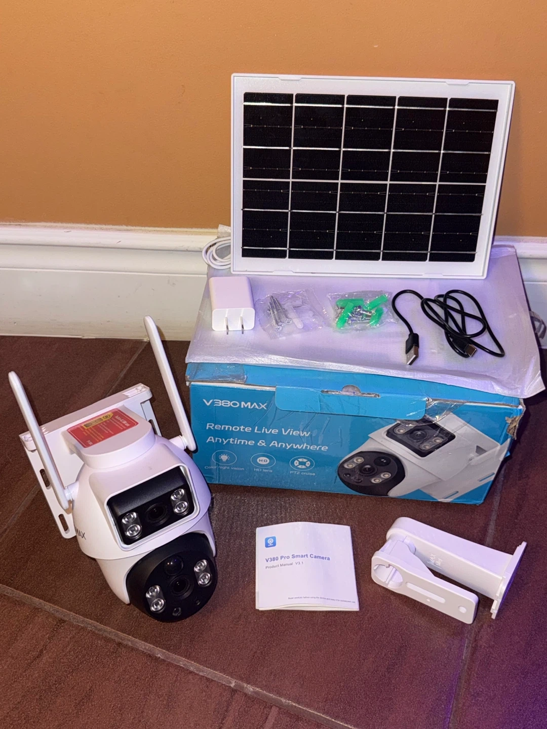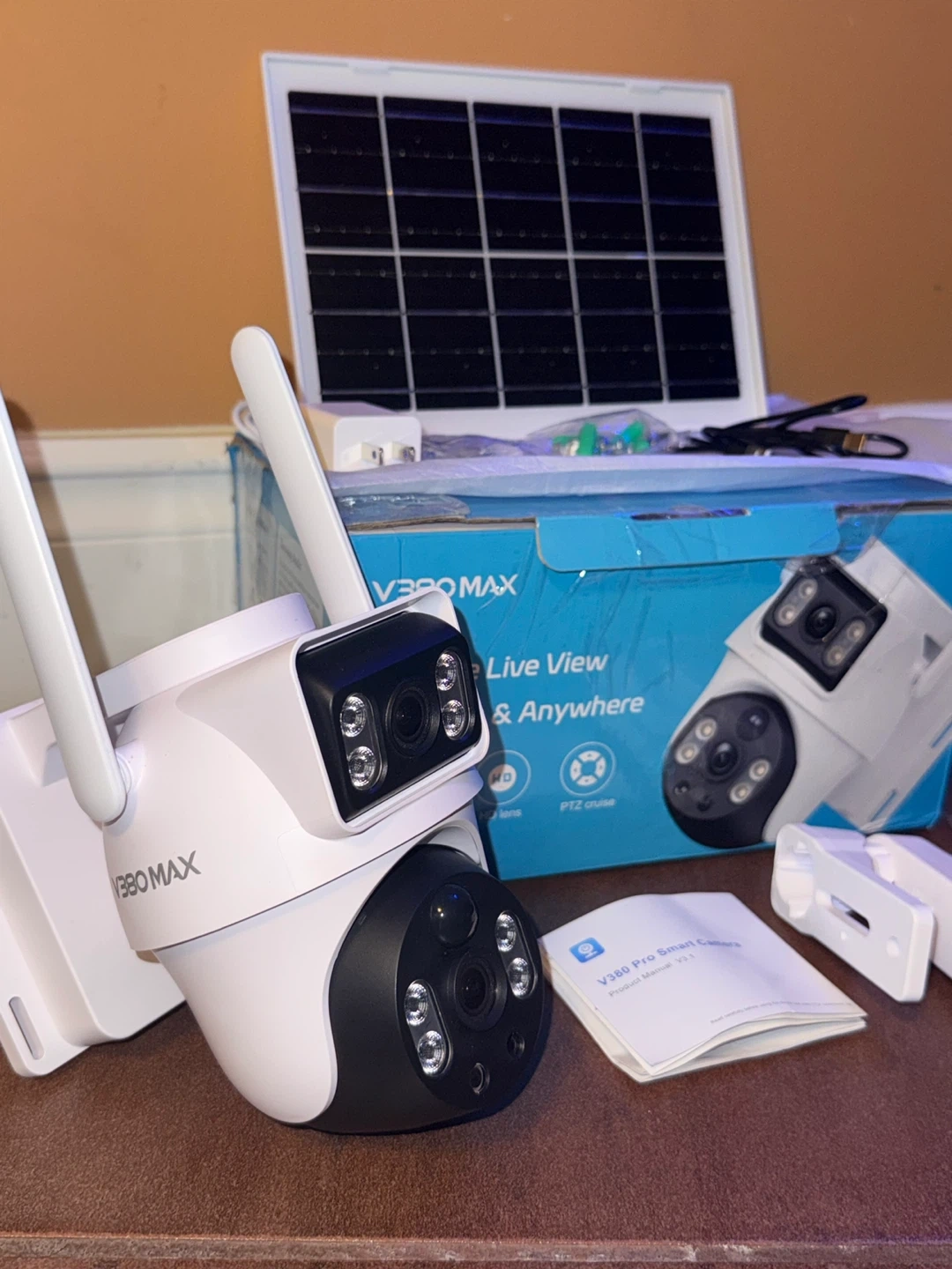 Selling a brand new V380 Pro Smart Camera for remote live viewing. It comes with everything you see in the pictures, including the solar panel and the original box. This camera offers a 355° pan and 90° tilt, ensuring you can cover every corner without any blind spots. The 2.5K resolution provides clear and detailed images, making it perfect for home security or monitoring. It also features colour night vision, HD lens, and PTZ cruise functions.