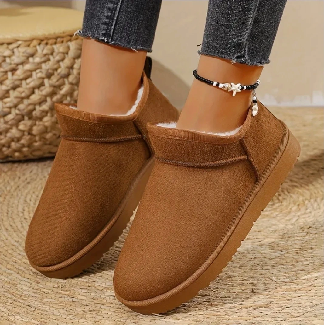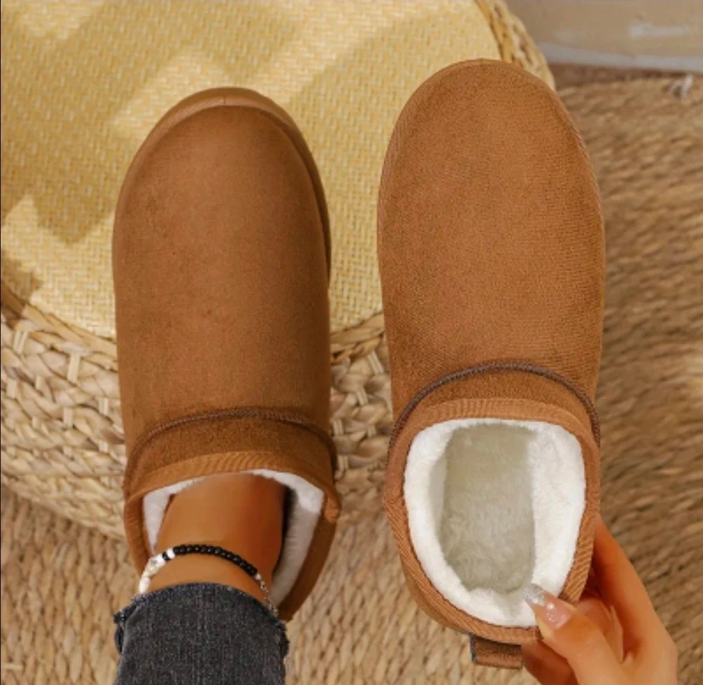 Cozy brown suede ankle boots with warm faux fur lining. These slip-on boots are great for keeping your feet toasty. Heel height is 7cm.