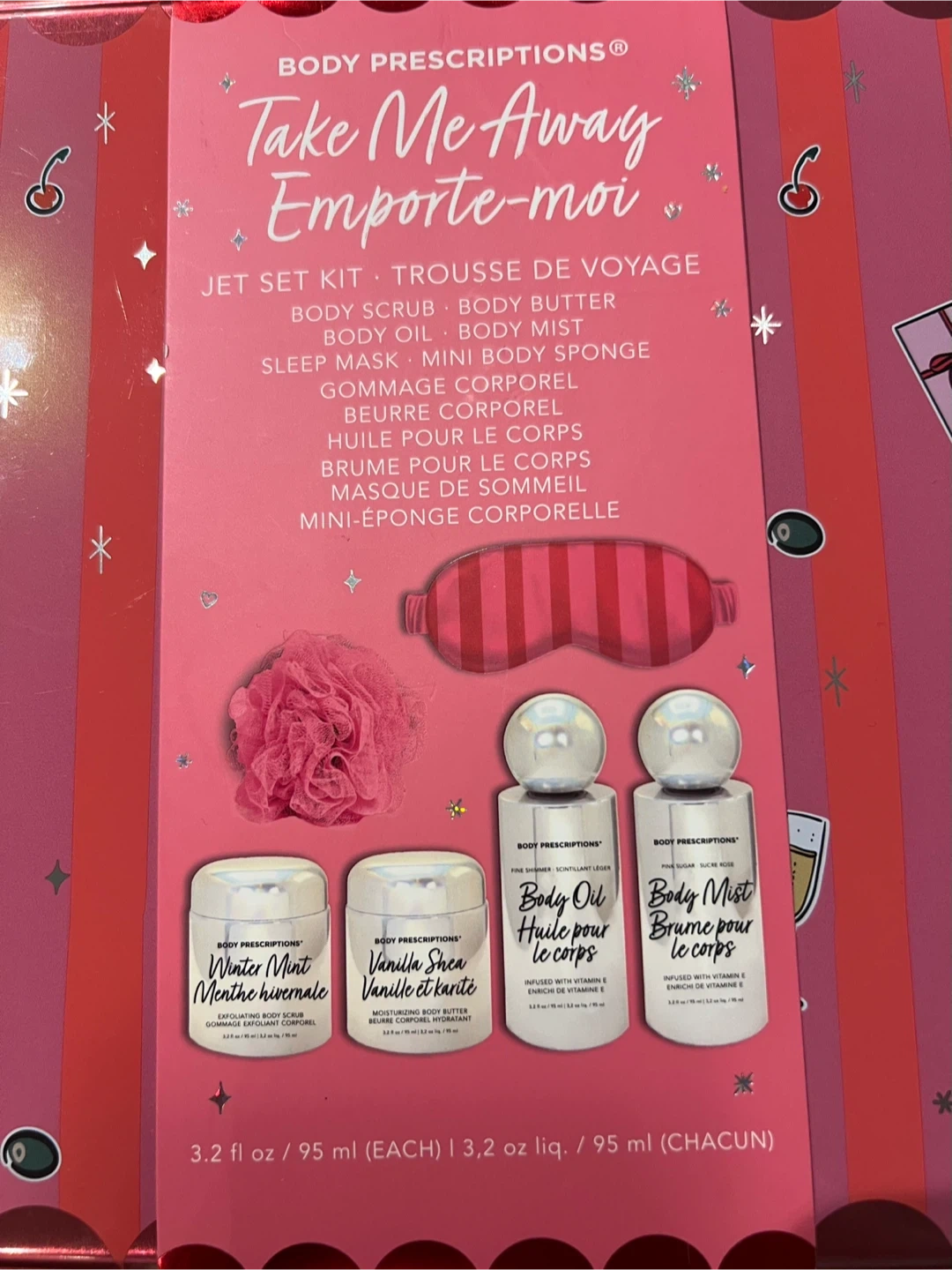 This Body Prescriptions Jet Set Kit includes body oil, body mist, winter mint body scrub, vanilla shea body butter, and a mini body sponge. Each product is 3.2 fl oz / 95 mL. It's all packed in a cute tin case!