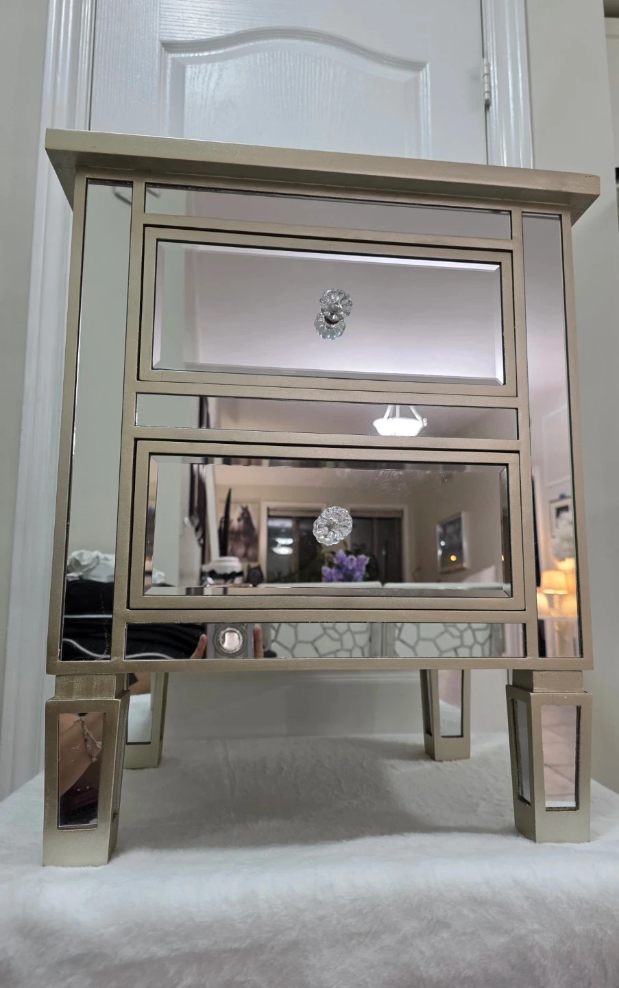This beautiful mirrored nightstand features two crystal-like drawer pulls. Its mirrored panels give it a sleek, modern look. It's a great addition to any bedroom or living space! Comes with shipping box.