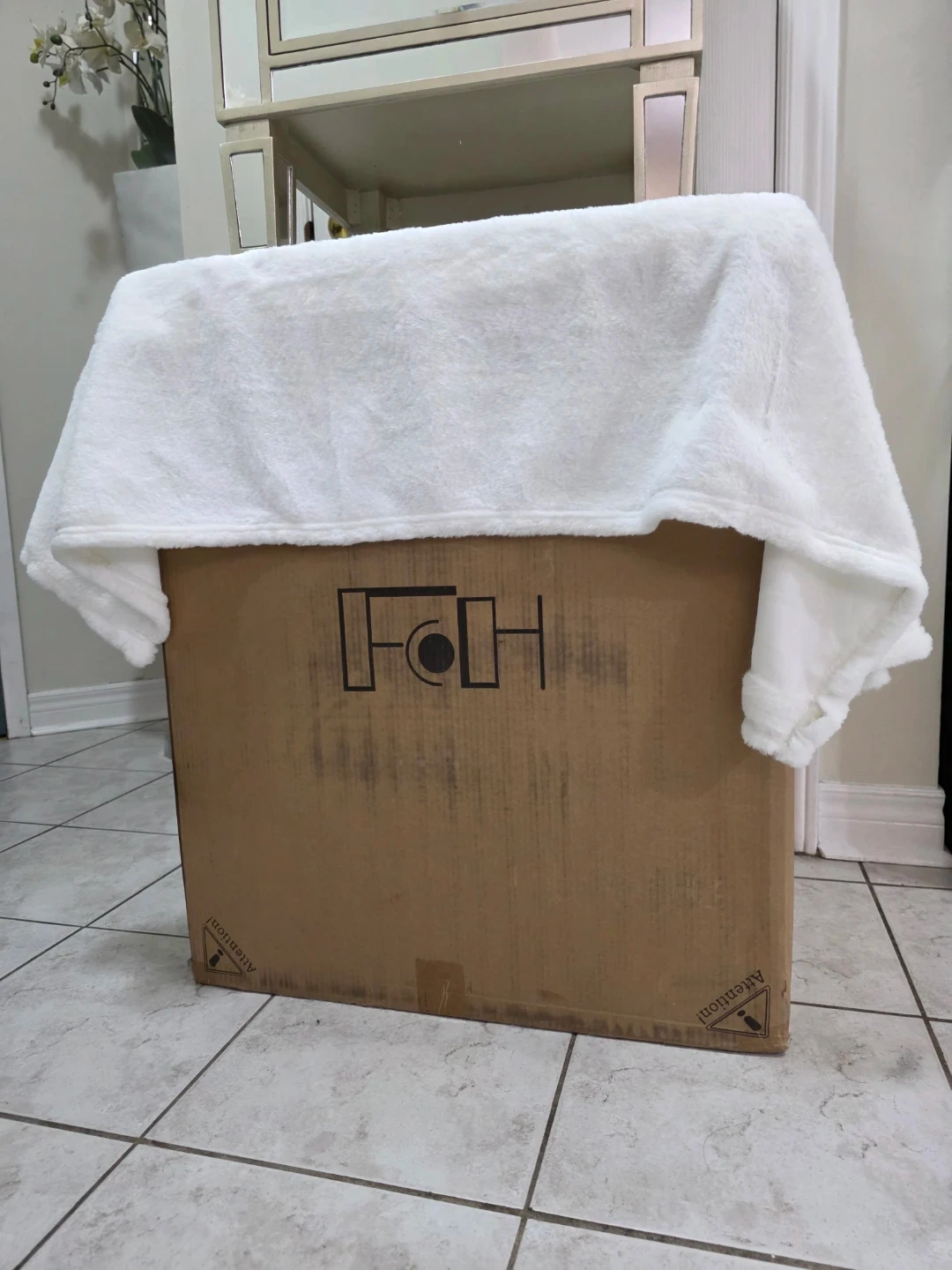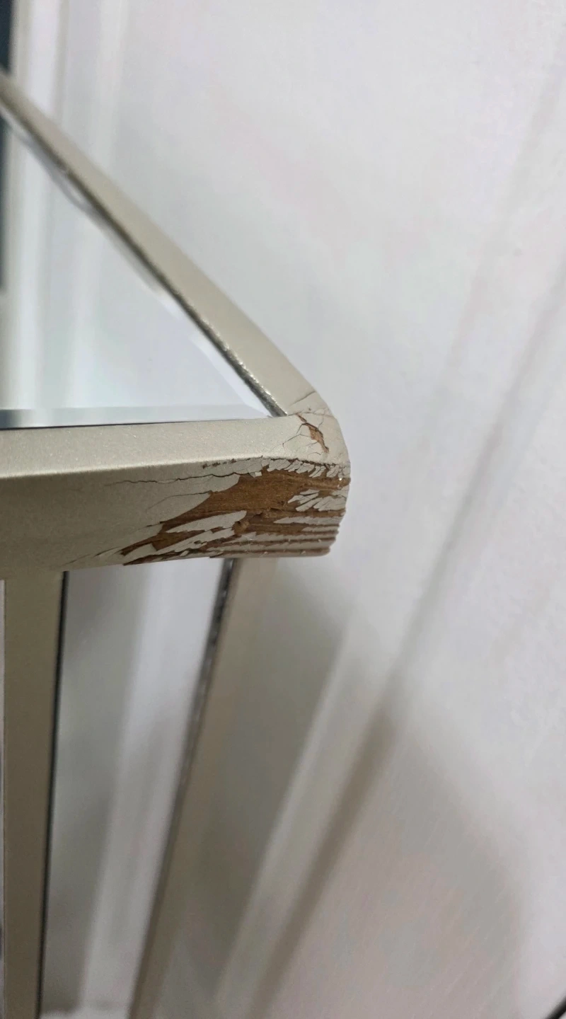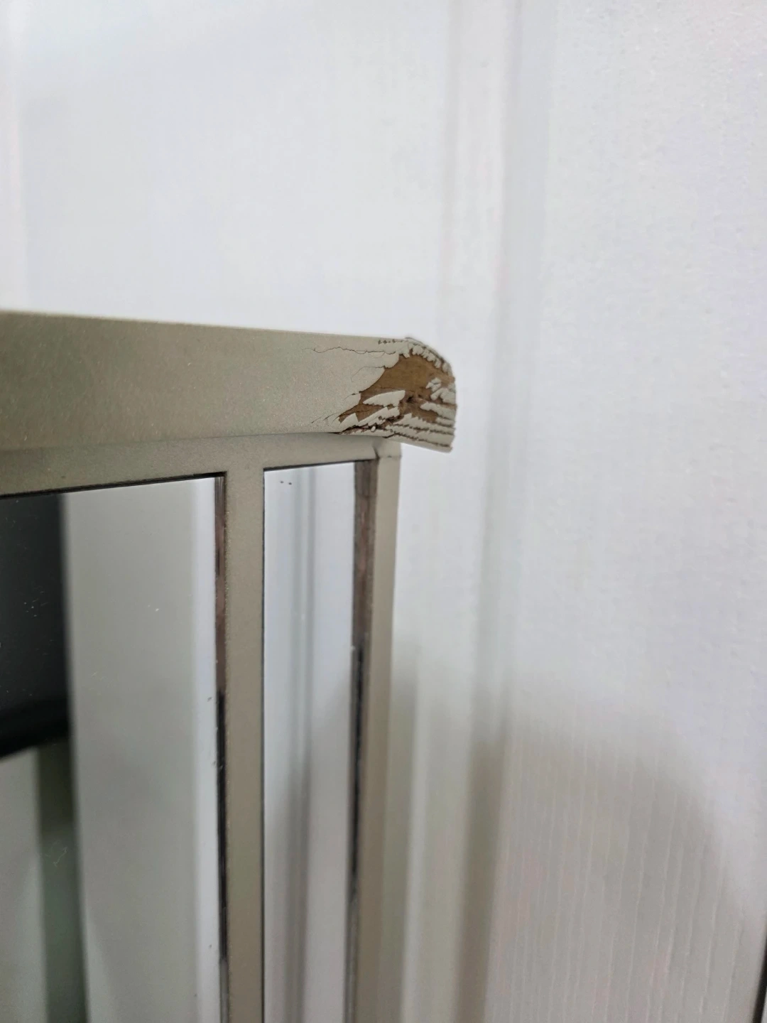 Back right corner dented during shipping. Can hardly see it againt wall and can be painted over. Does not affect its use.