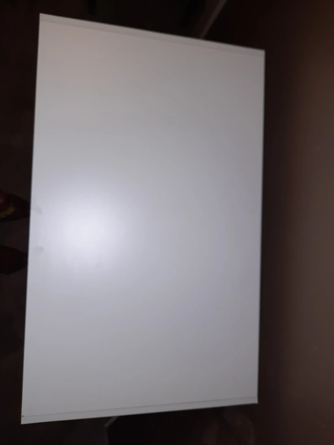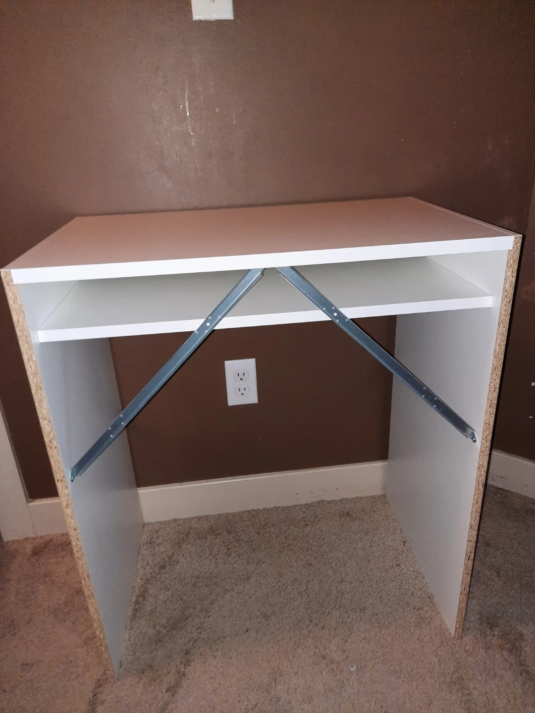 This is a simple Ikea TORALD white desk with a shelf underneath. It's a good size for a computer or writing. It's sturdy and has a clean, modern look.