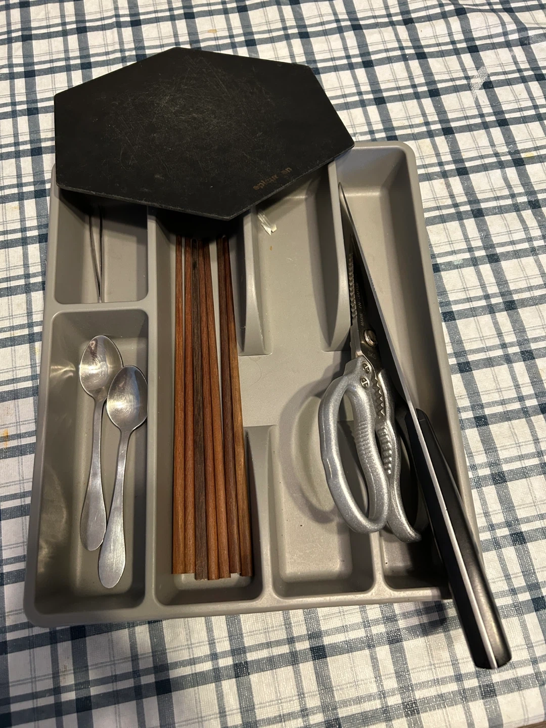 Declutter your drawers with this handy kitchen utensil organizer tray! It's perfect for keeping your spoons, chopsticks, scissors, and other kitchen tools neatly arranged. It also comes with a black cutting board on the side.