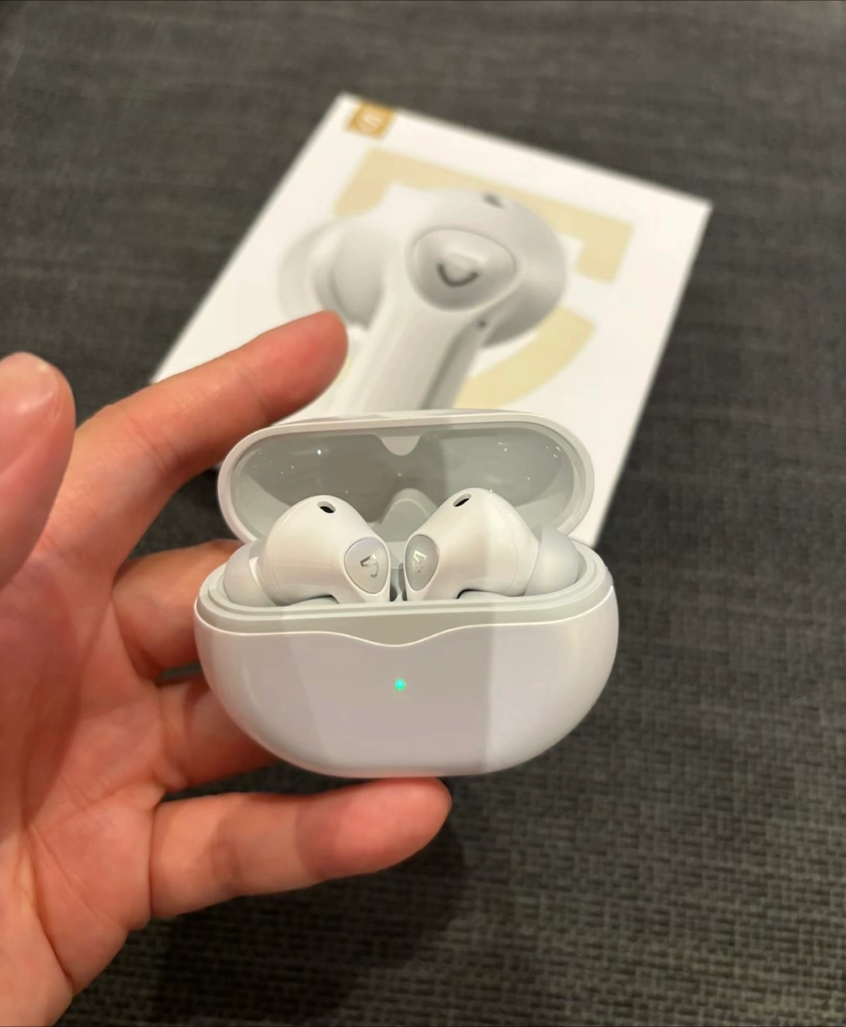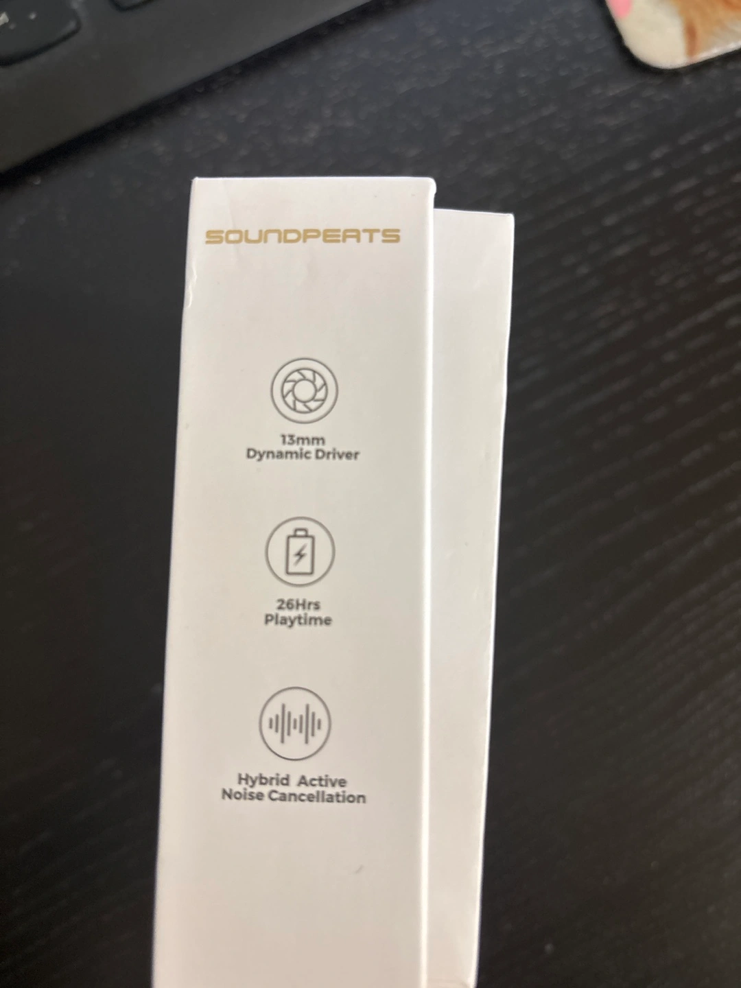 White earbuds with charging case. Features hybrid active noise cancellation and 26 hours of playtime. 13mm dynamic driver. Mint condition.