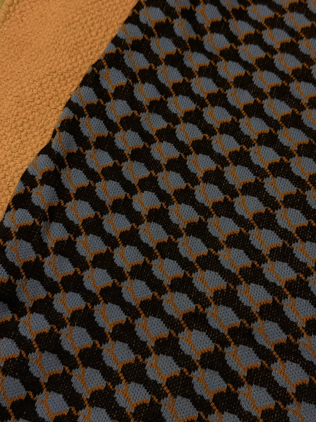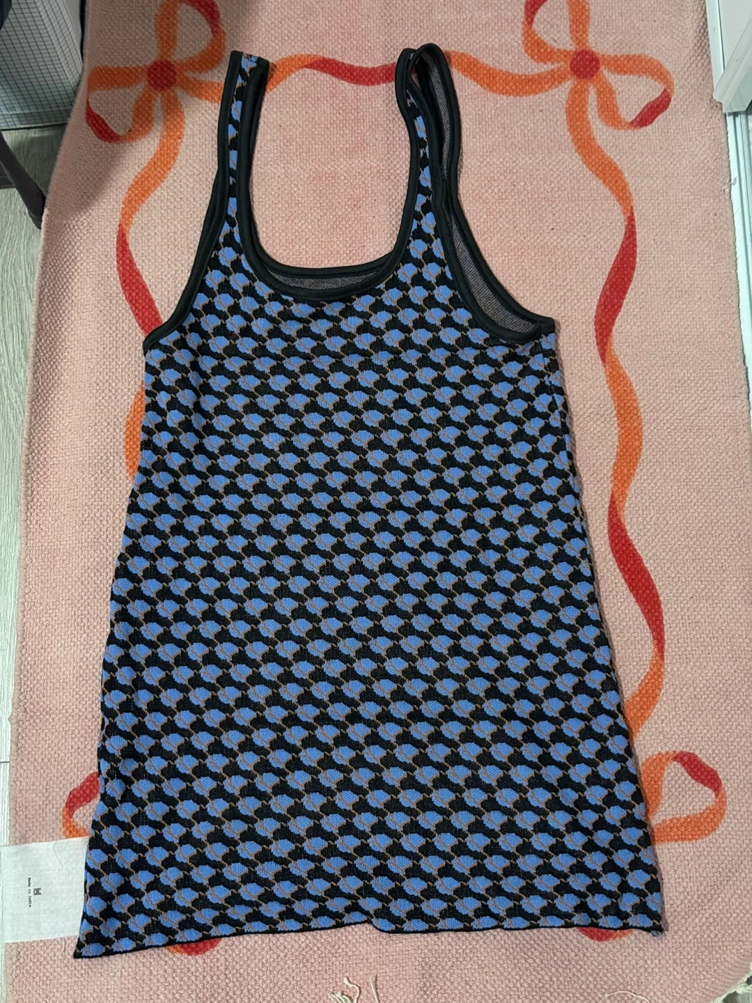 A sleeveless tank dress with a blue, black, and orange geometric pattern. It's a size medium. This top would be useful for layering or wearing on its own during warmer weather.