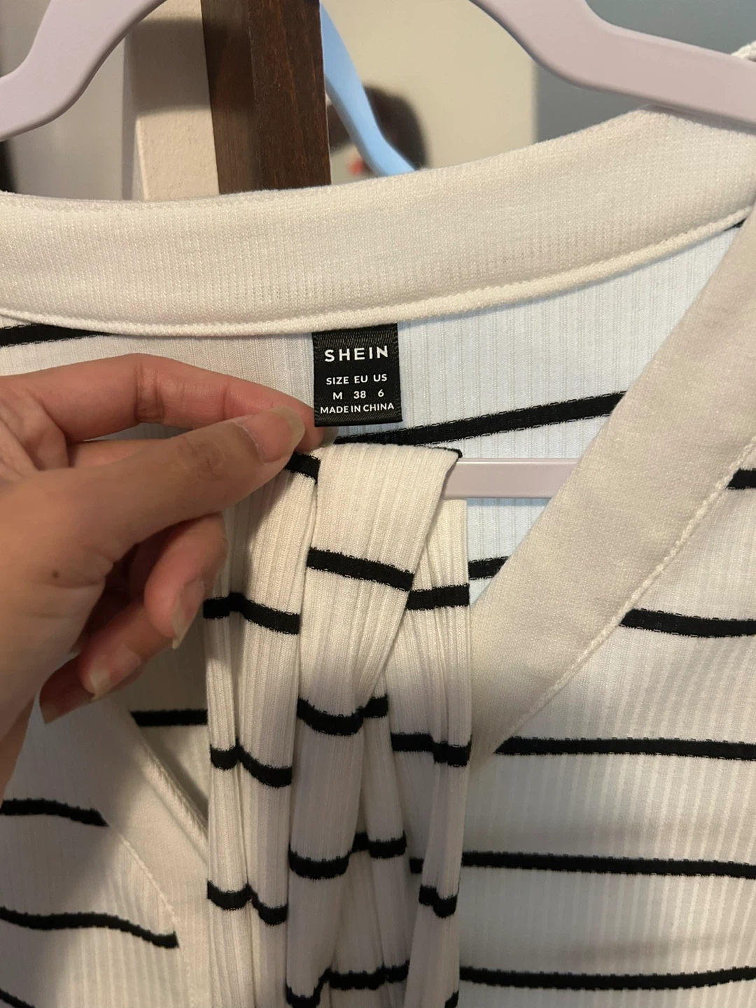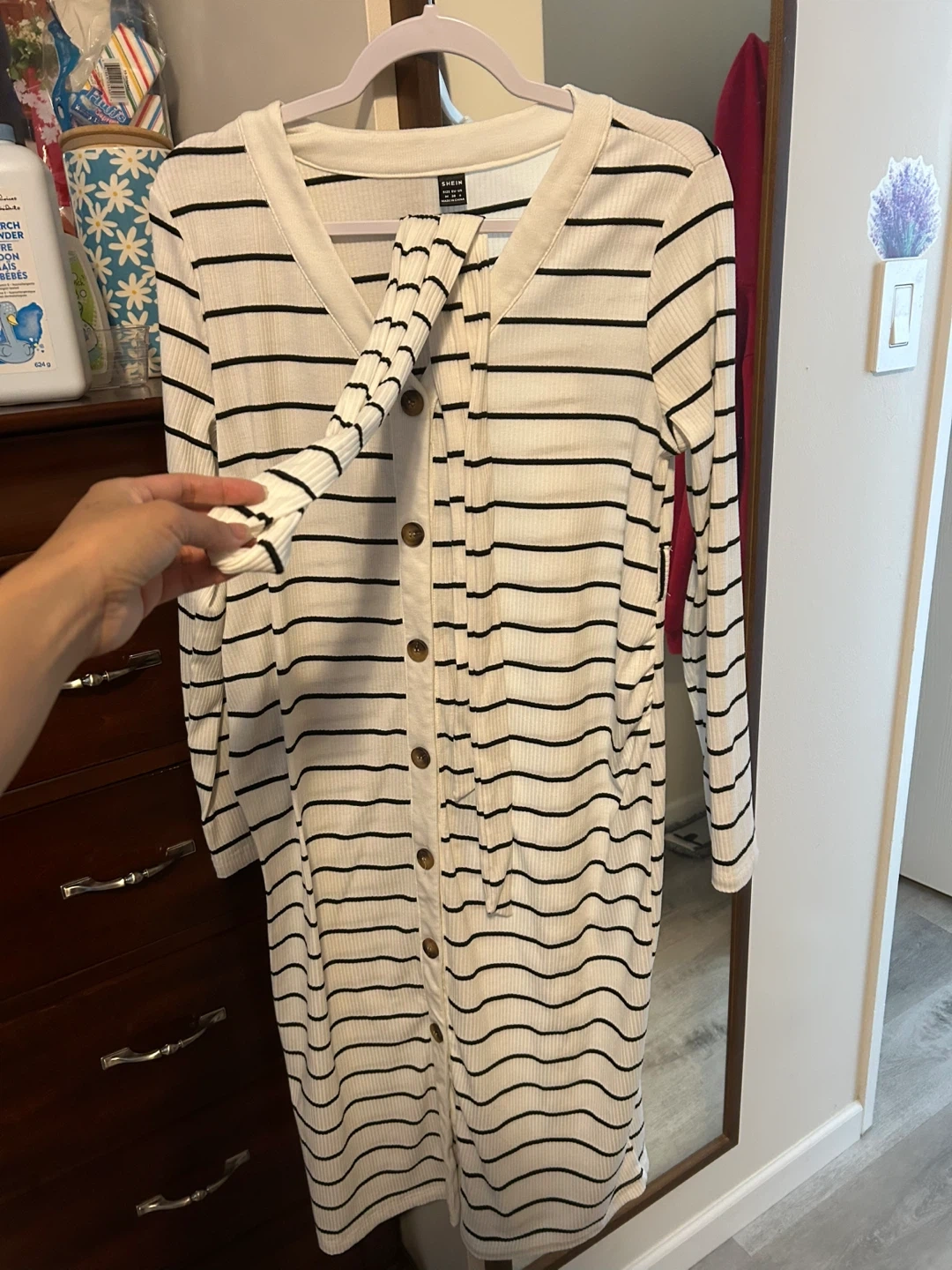 White and black striped midi dress from SHEIN. Features a V-neck, long sleeves, and a button-up front. Made of ribbed material. Size M.