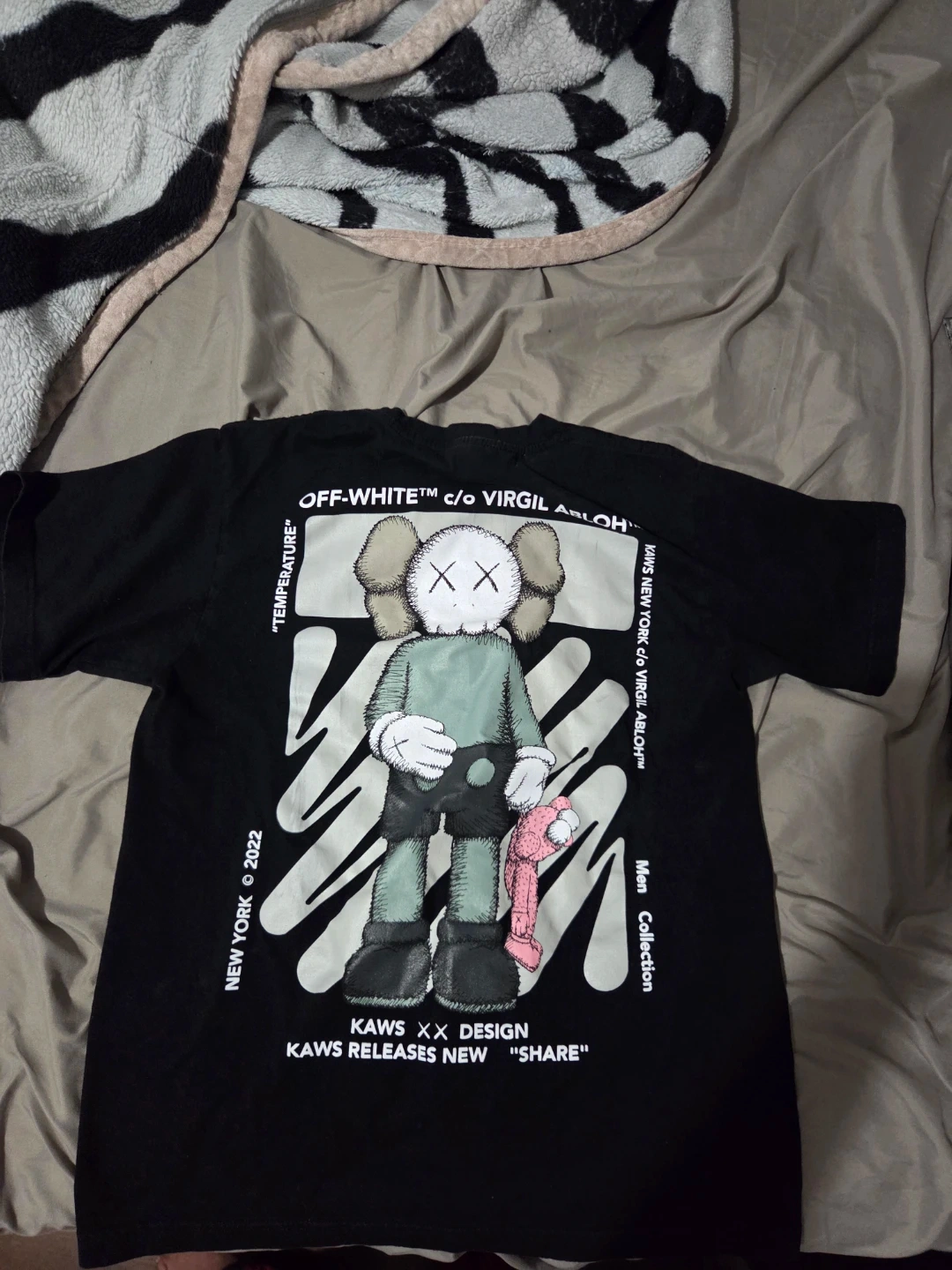 This is an Off-White x Kaws t-shirt. It's black and size medium. 100% cotton material.
