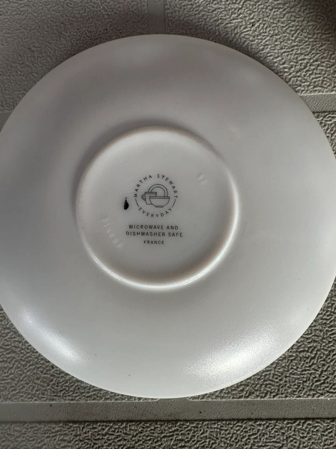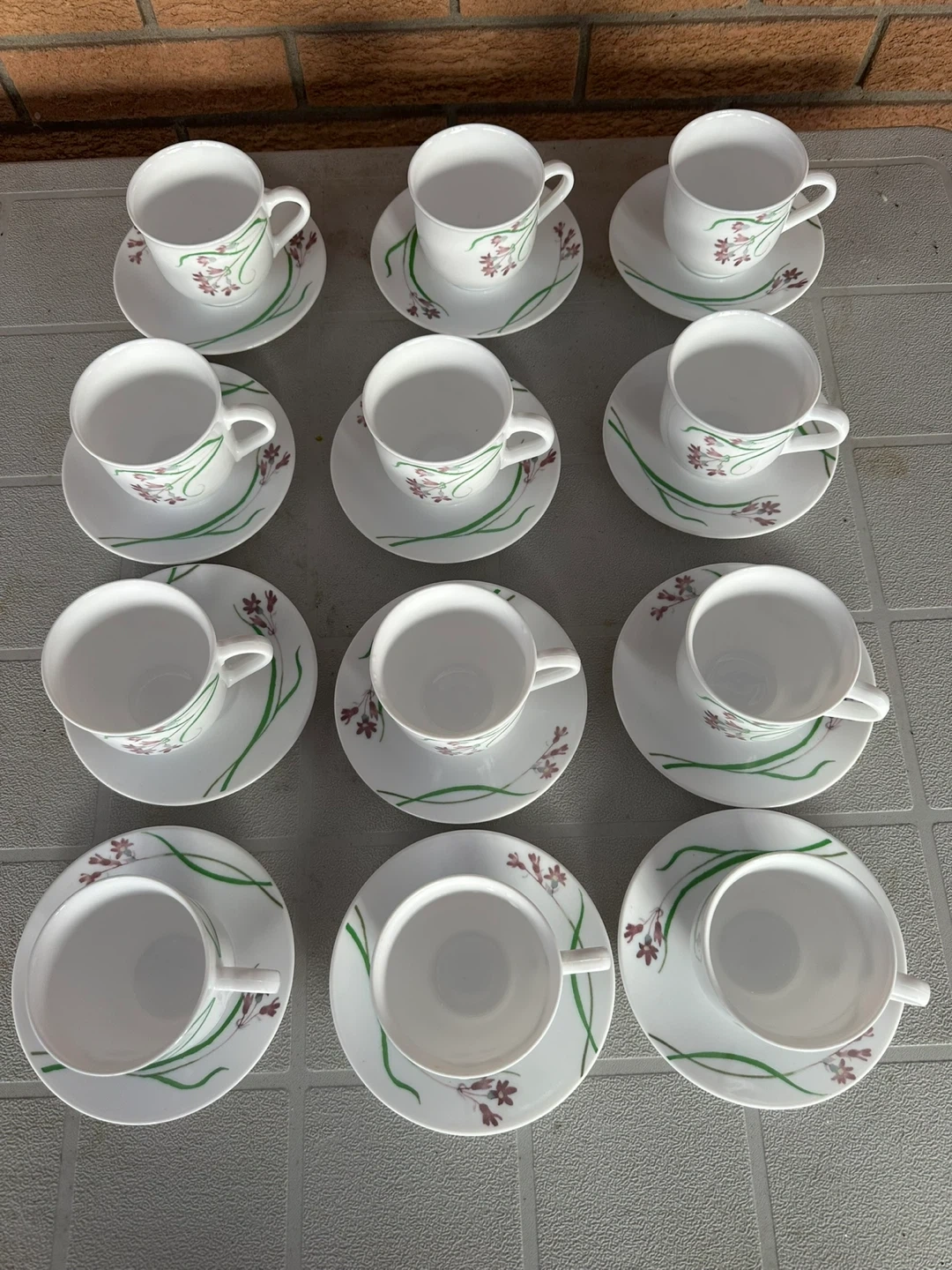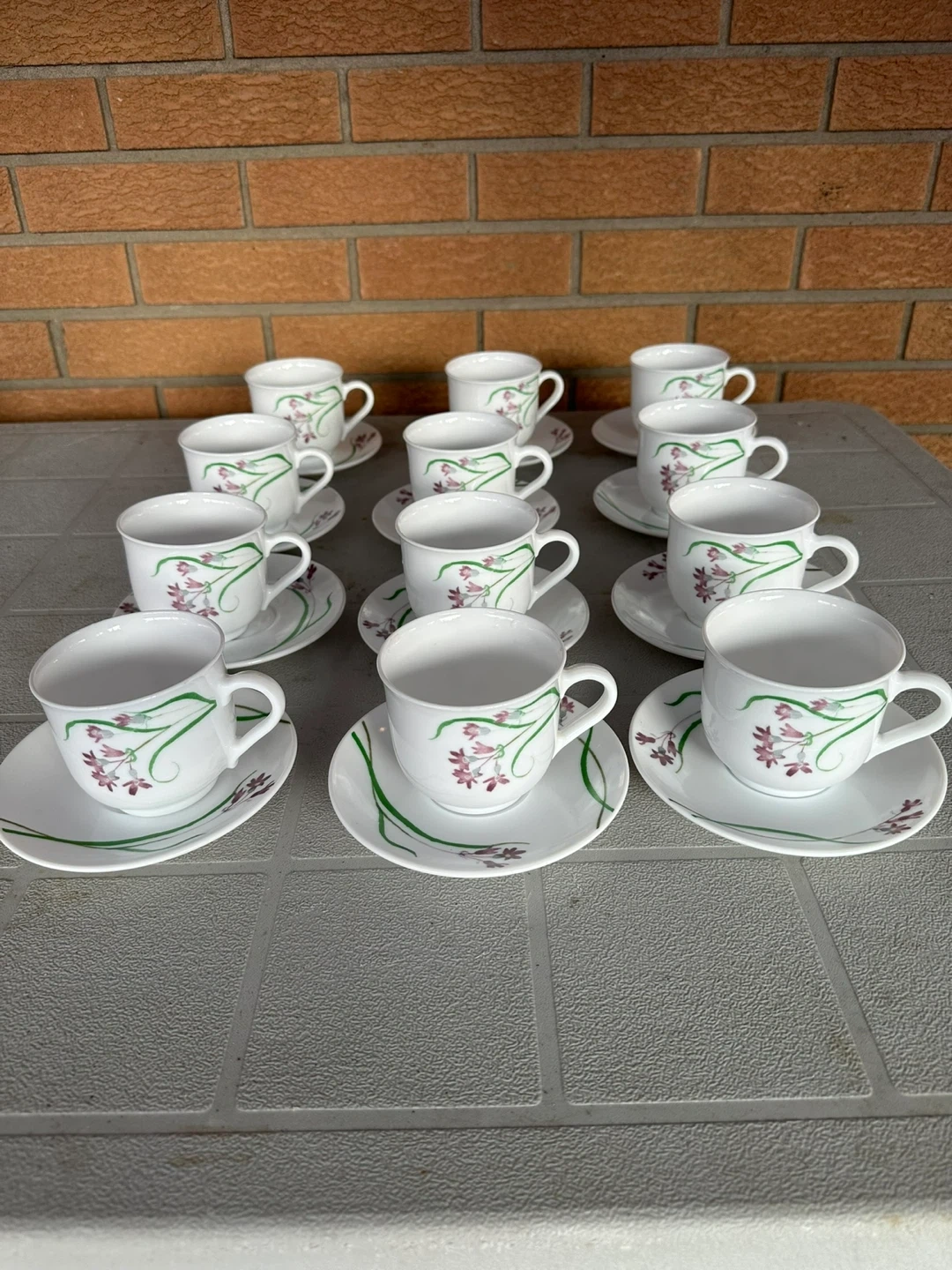 A set of 12 white cups and saucers with a delicate floral design. Made in France, microwave and dishwasher safe. Perfect for serving guests or everyday use! Never been used