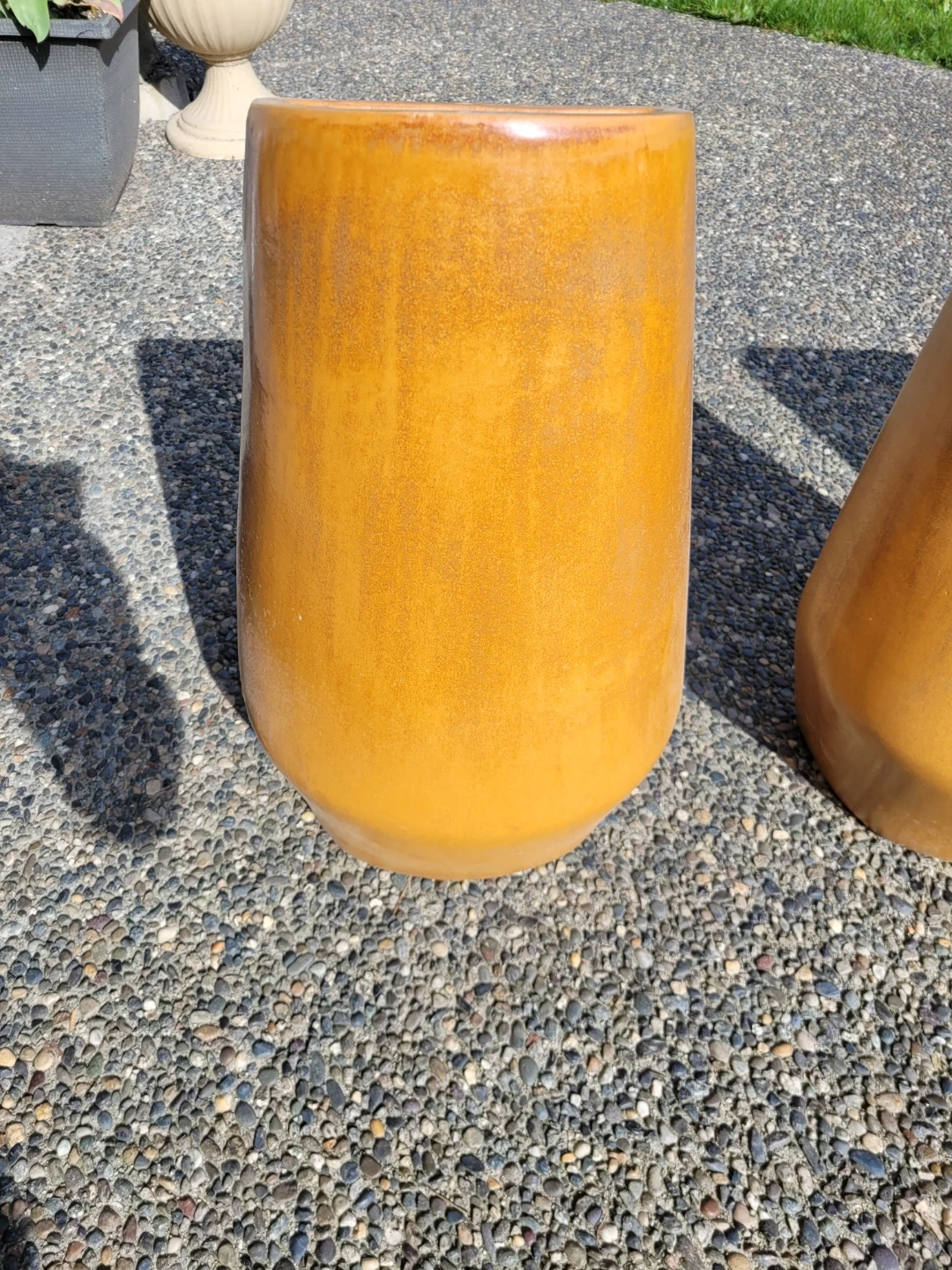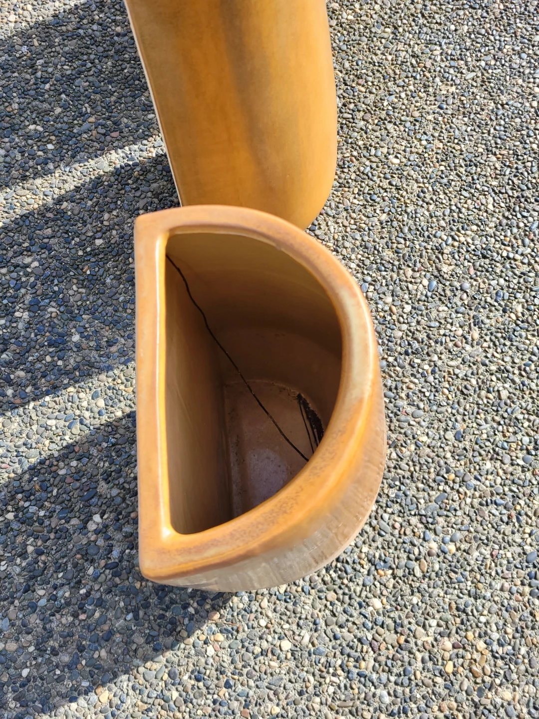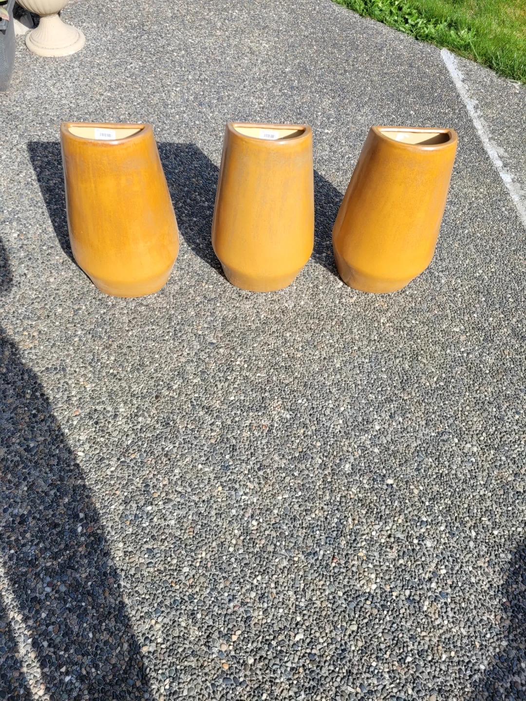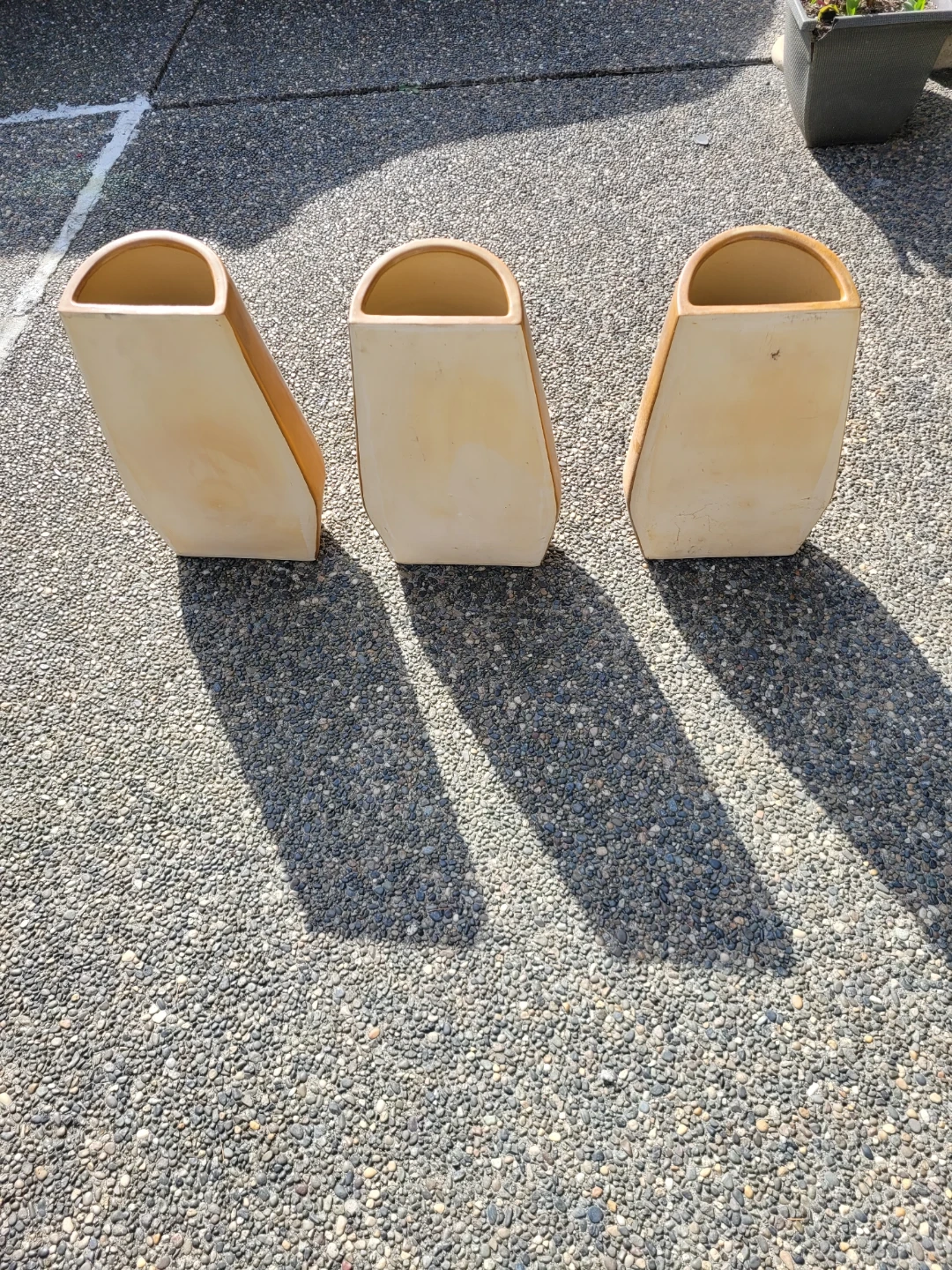 Three orange D-shaped ceramic planters. These planters have a glossy finish and a unique shape. They're perfect for adding a touch of colour to your garden or patio.