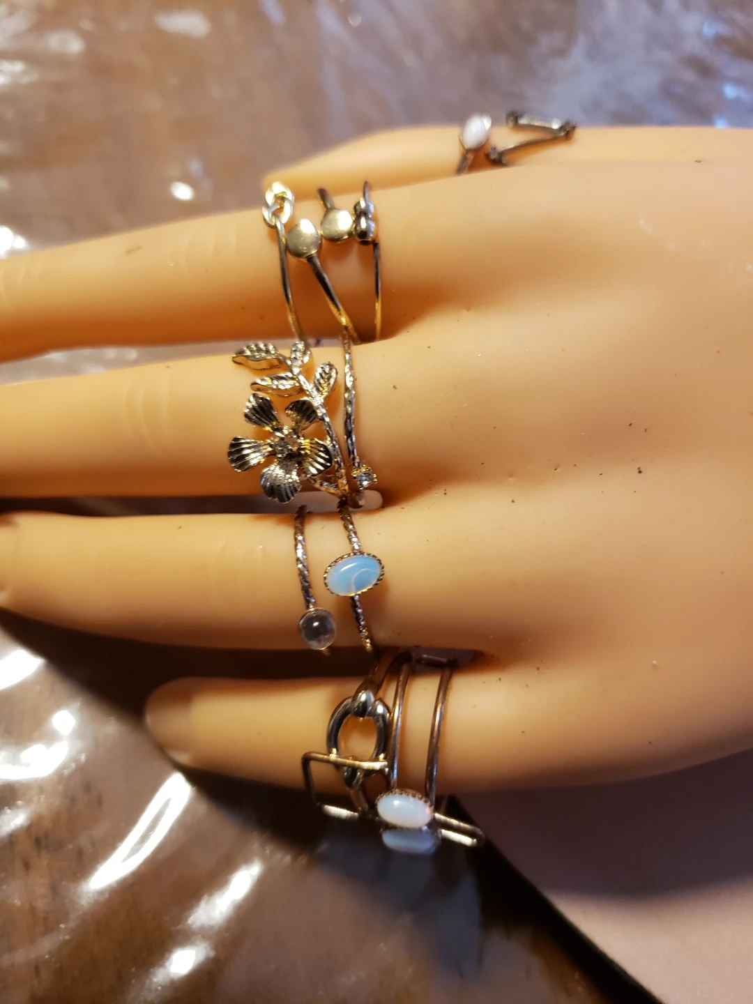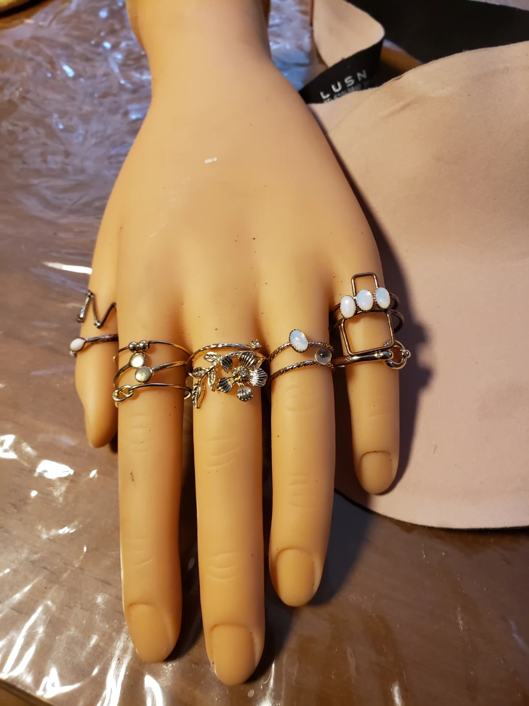 This is a set of assorted midi rings from H&M. It includes rings with various designs like knots, flowers, and stones. This set is perfect for layering or wearing individually!