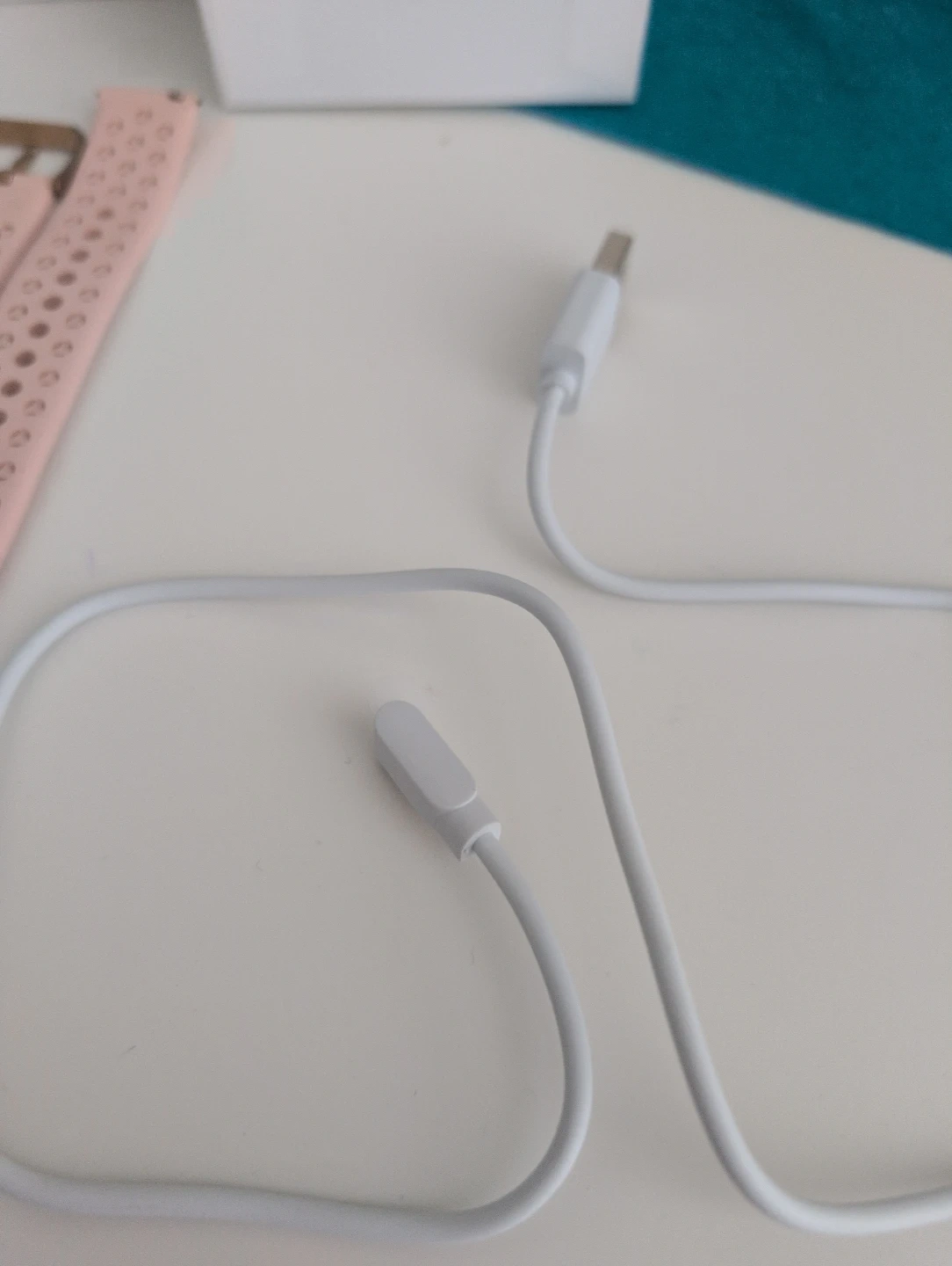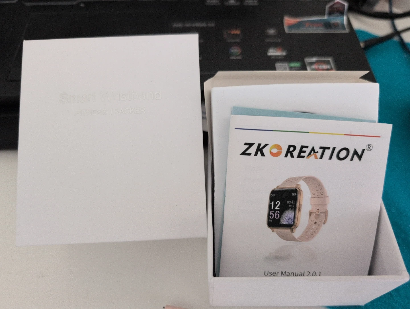 This ZKREATION smart wristband is a fitness tracker. It comes with a rose gold watch case and a black perforated band. An extra pink band is also included. A USB charging cable is provided.