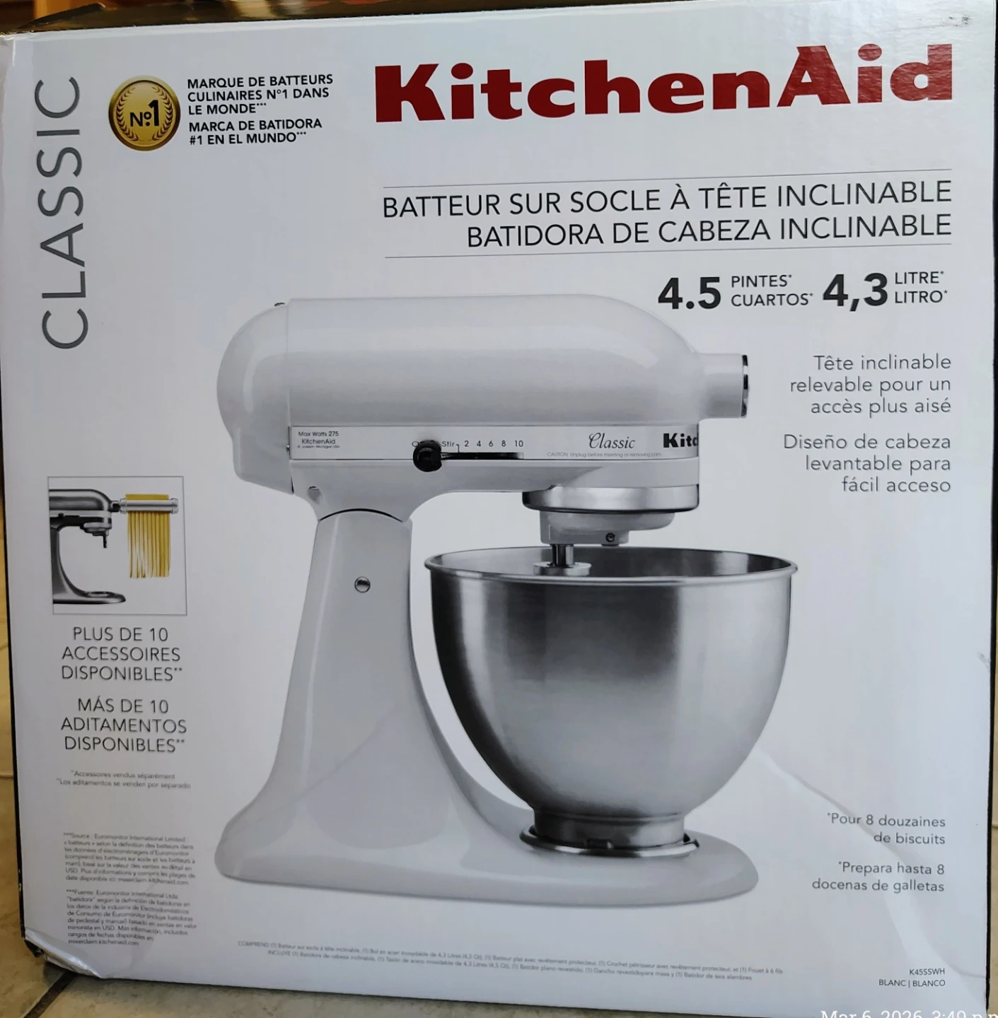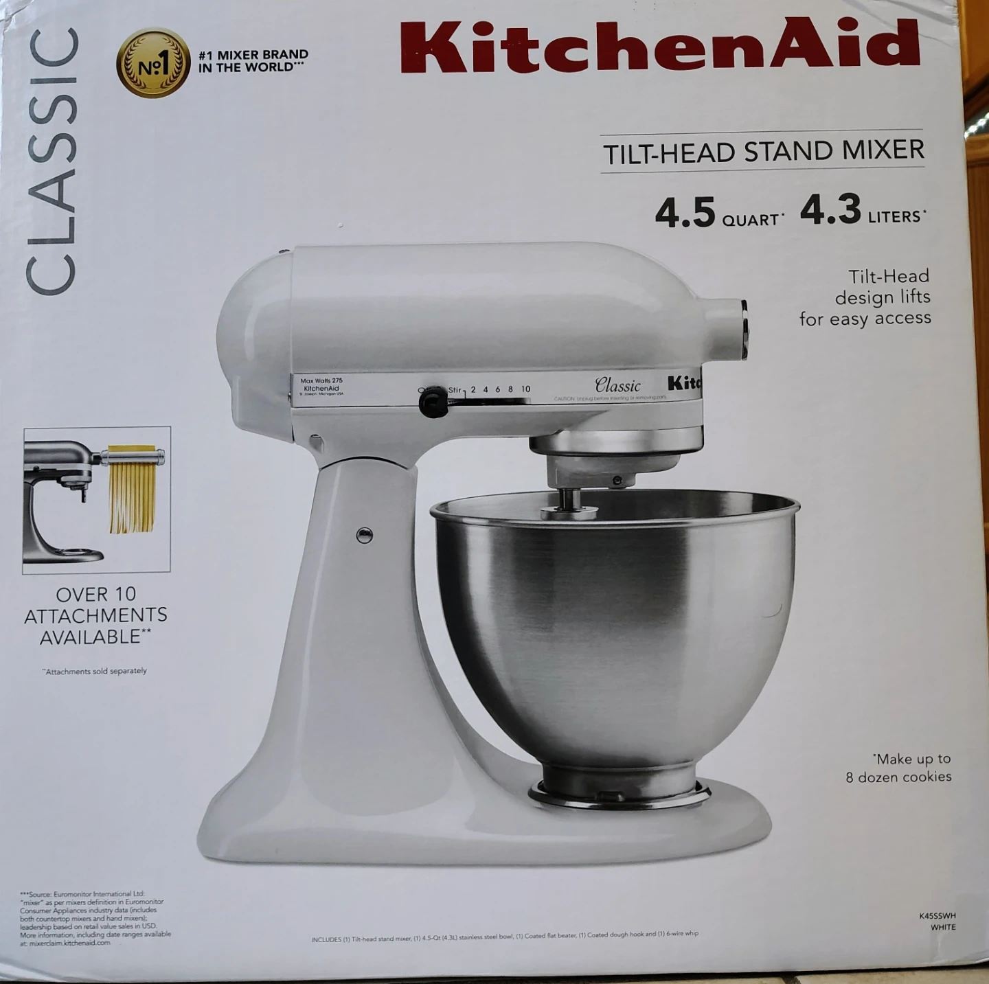 This is a KitchenAid Classic tilt-head stand mixer. It features a 4.5 quart brushed stainless steel bowl. Over 10 attachments are available to expand its capabilities.
