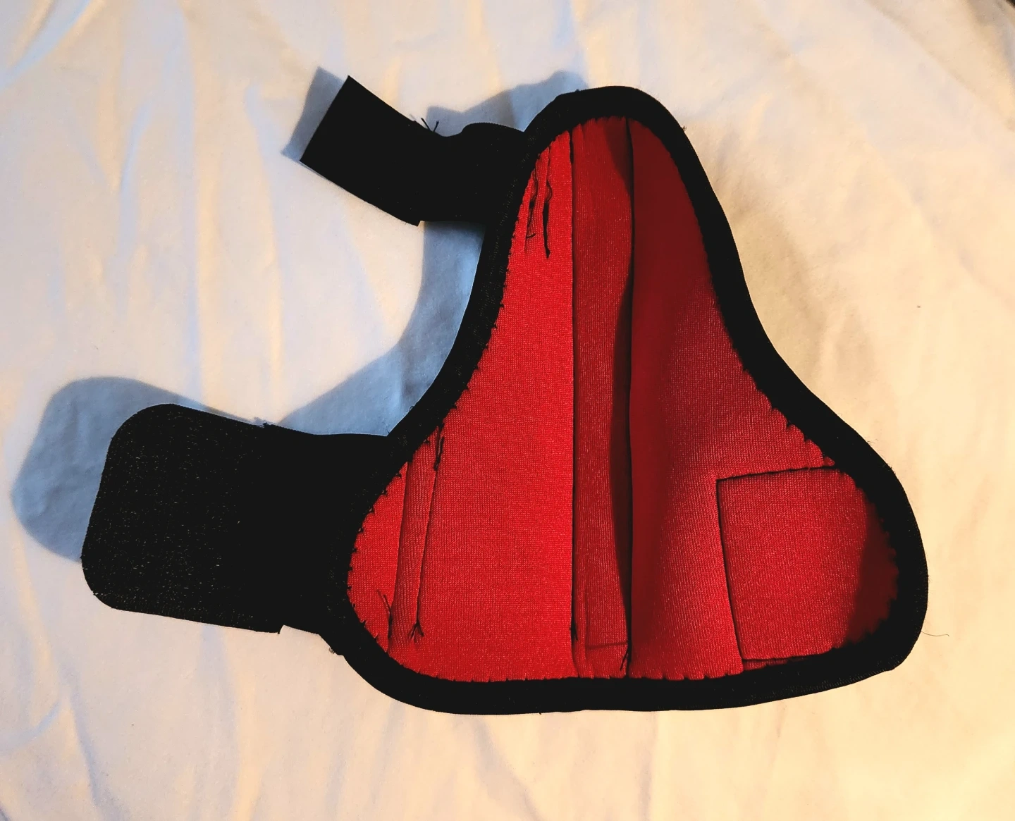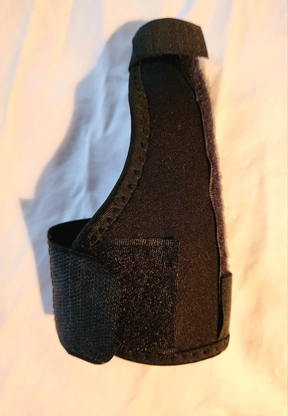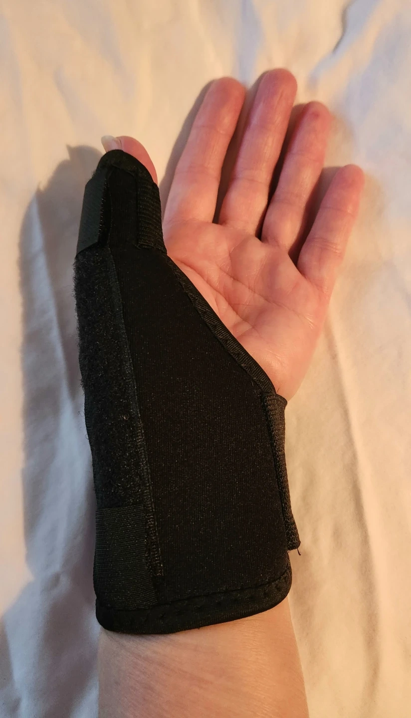 This new black thumb spica splint brace is designed for comfort and support. It features adjustable straps for a secure fit and a red inner lining. It helps immobilize the thumb and wrist.