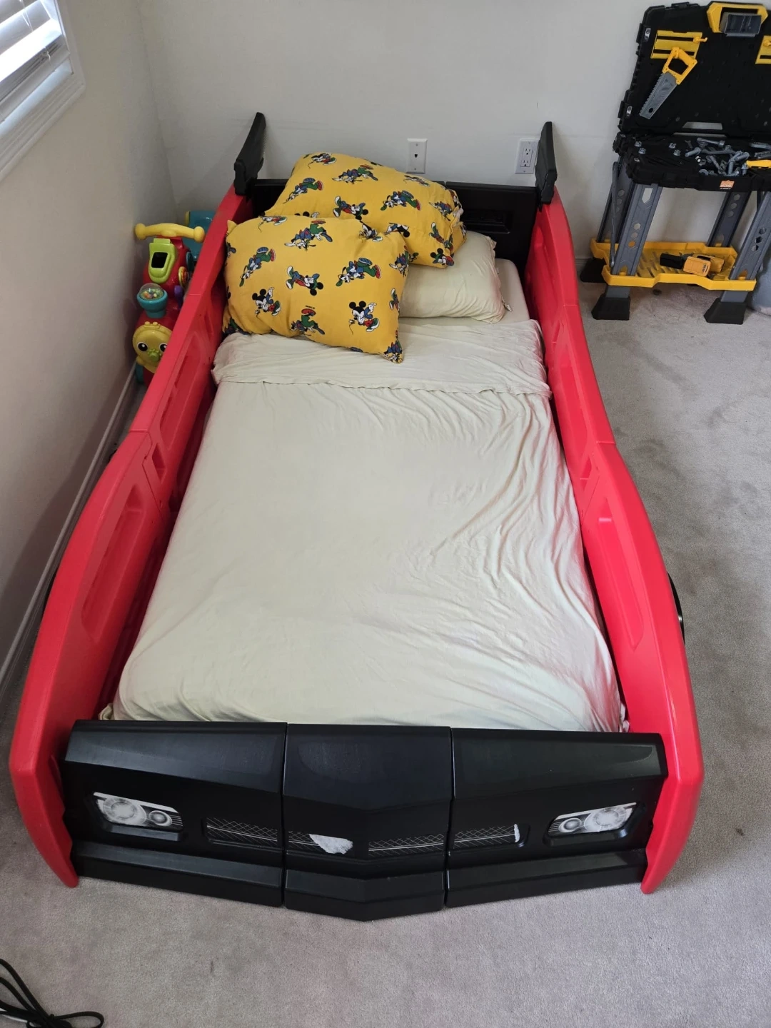 This fun red race car bed is perfect for a child's room. It features a sturdy plastic frame with realistic tire accents. It's designed for a toddler or twin-sized mattress.